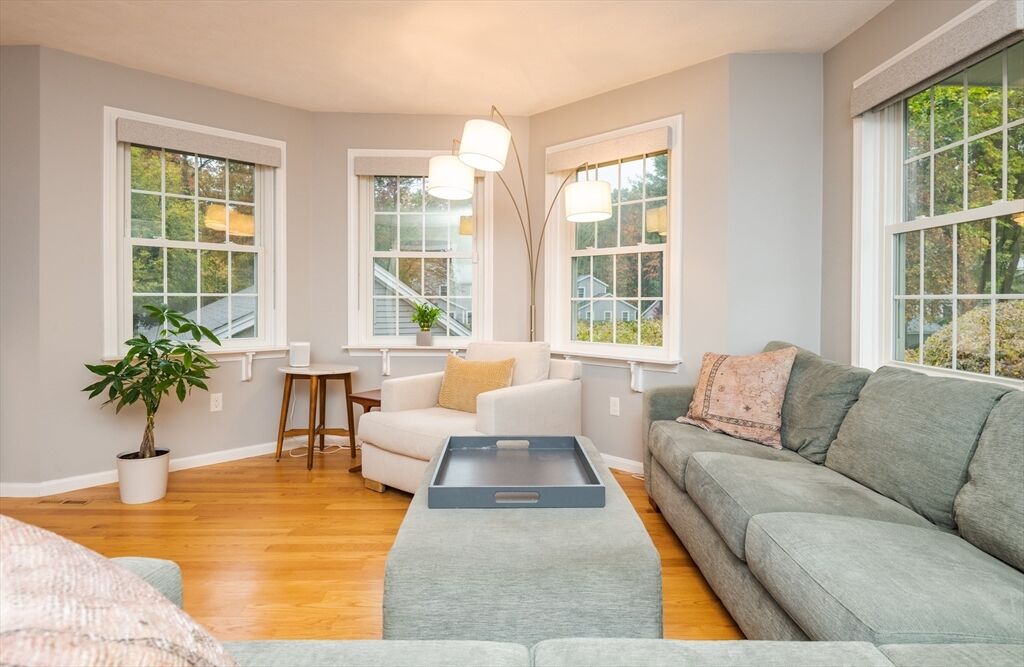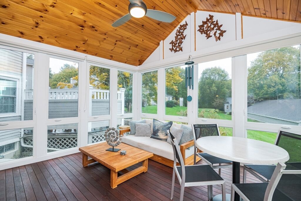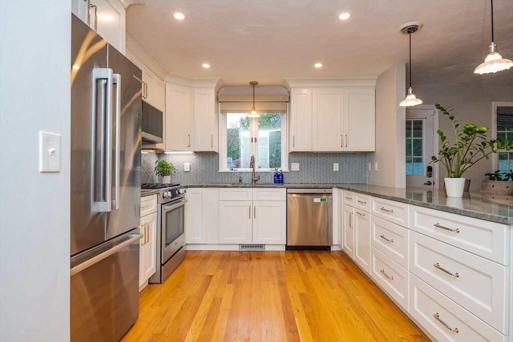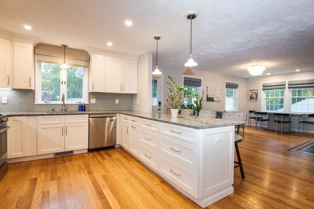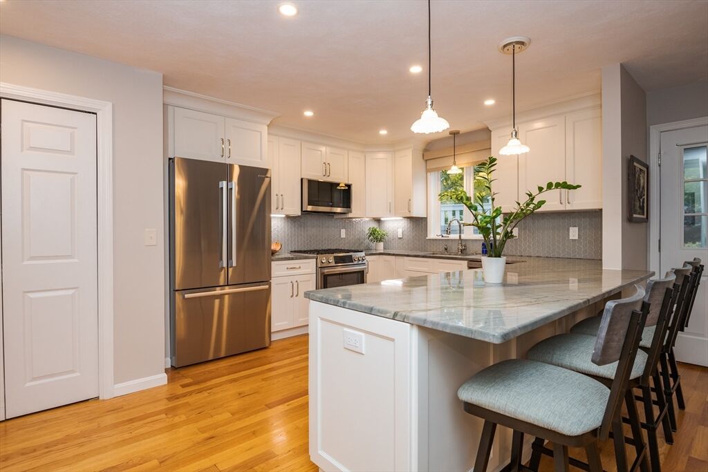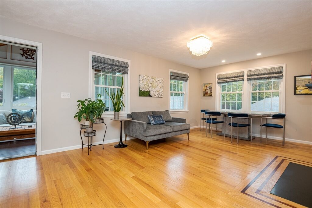 Rare, special, luxury living, absolutely ZERO to update, MOVE-IN and ready to ENJOY! Peaceful Three Season SunRoom allows for a vacation sanctuary in the home. Bright and sunny home was completely renovated and re-imagined with classical and modern selections in the past few years. All H/W floors throughout both levels. NEW in 2025: White Gas Kitchen equipped with Quartzite countertops, peninsula island seats 4 w/extra cabinet storage, pantry closet, custom pendant lighting, under cabinet lighting, Bosch and LG SS Appliances. Conveniently located on the Lexington line in Bedford. Expanded open concept main level includes a sought after and unusual 1st Floor Primary Suite that boasts of a walk-in closet with custom built-ins, an extra closet, and an en-suite remodeled full bathroom! Home office area located in a lofted open area. NEW finished lower level for family room, recreation, and exercise areas.Lots of Storage!12miles from Boston, Minutes to highways (Rte 95/128 &Rte 3)&shopping!