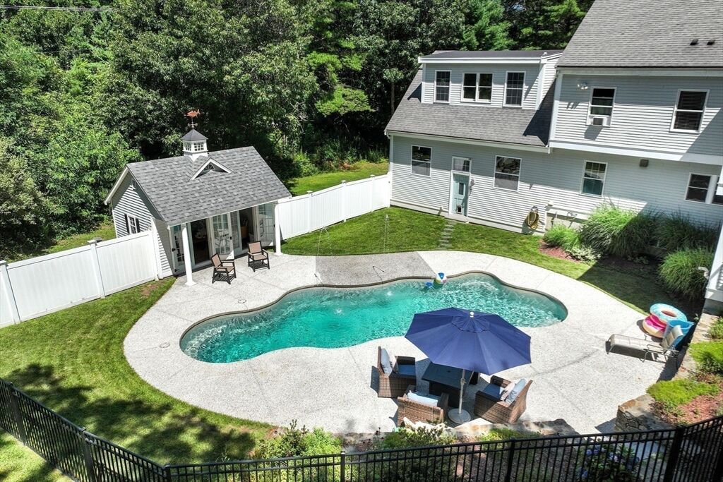 Amazing & Private 4-6 bed, 4 bath home tucked away on a private 2.2-acre retreat lot, with tremendous expansion option, offering three full levels of living. Inside, you’ll find a spacious layout perfect for entertaining & everyday living. The sun-filled primary features soaring ceilings, an en-suite bath, & French doors opening to serene views of the fun backyard. The heart of the home features generous living and dining areas, a modern kitchen, and flexible spaces to suit your lifestyle. A 3rd-floor walk-up offers the ideal space for teens or guests to spread out! With room for everyone, this home is both functional & inviting. Over the garage is a huge unfinished space with cathedral ceilings, offering amazing potential for a second en-suite, in-law suite apartment, or ADU. Step outside to your own private resort: a sun-drenched backyard with an in-ground pool, Pebble Tec patio, hot tub, & a heated pool house w/TV. Direct access to the Bridal Path and close to Humarock!