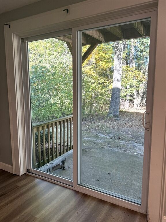 Easy 1-level living in this adorable Garden-Style, First Floor End-Unit located in desirable Hillshire Farms!! Bright open layout with beautiful vinyl plank flooring throughout, recessed lighting, quartz kitchen countertops, fully-equipped kitchen and slider to patio area facing wooded area. Walk-In closet in hallway and back bedroom. Convenient In-Unit stackable laundry. Prime front corner location with easy access to assigned parking for 2 cars on newly paved driveway. Spacious and beautifully landscaped grounds. Low condo fee. Gift to buyer: Stackable Washer/Dryer and Large Flat Screen TV. Close to shopping, dining and area amenities. Only 1.5 miles to UMass North Campus. Minutes to tax-free NH. Estate Sale is ready to go. Perfect for 1st time buyers, downsizers or investors. Sold As Is - As Seen. Easy to show.