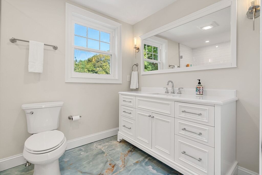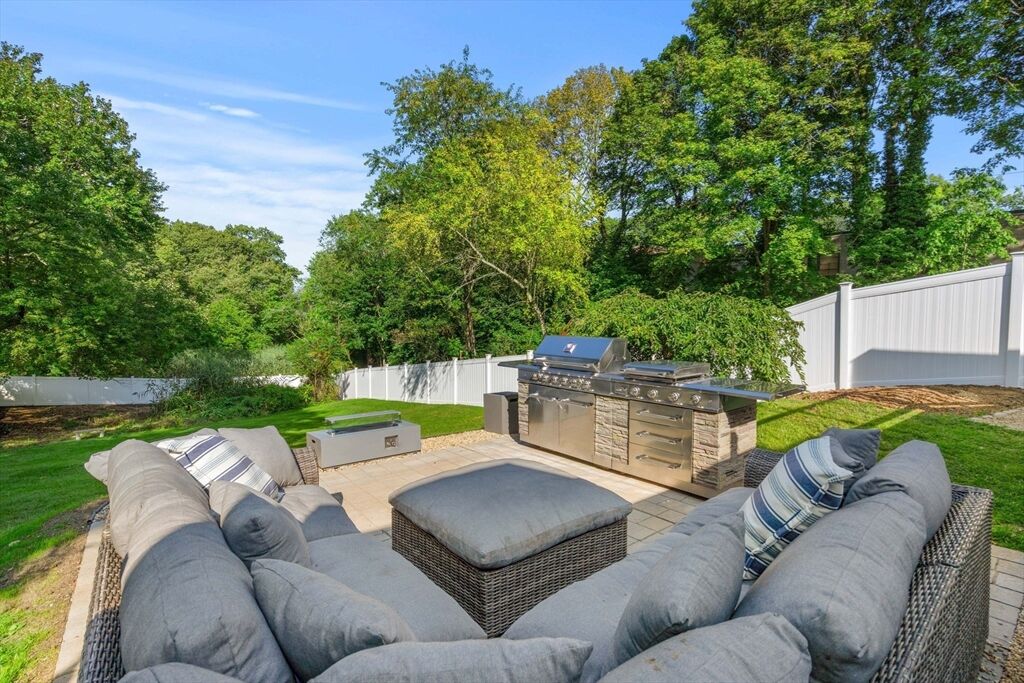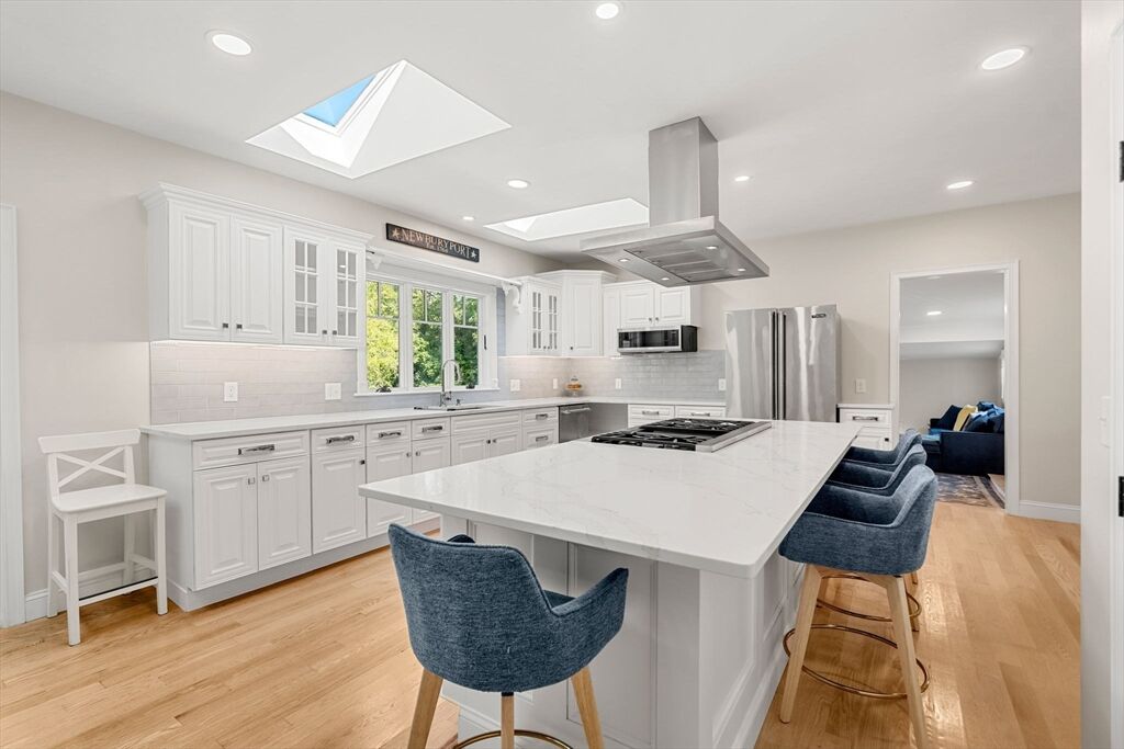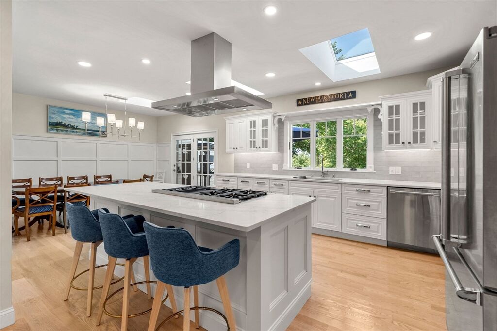 Exquisitely reimagined in a 2024 gut renovation, this 4-bedroom, 2.5-bath townhome offers the perfect blend of refined luxury & coastal charm. The open-concept main level is anchored by a chef’s kitchen with new Thermador & Viking appliances, oversized quartz island & custom cabinetry, flowing seamlessly into sun-drenched living & dining areas with skylights, recessed lighting & a gas fireplace. French doors open to an expansive 42' deck with sweeping Merrimack River views, while over half an acre of manicured grounds provide a fully fenced yard, newly installed stone patio—ideal for family fun & entertaining. The private primary suite boasts dual closets & a spa-inspired bath. Every element has been renewed, from insulation, electrical to high efficiency heating/cool systems, ensuring turnkey living. No condo fees, 2+ driveway parking & just minutes to downtown Newburyport’s waterfront, shops, and dining, this rare offering defines coastal elegance & convenience.