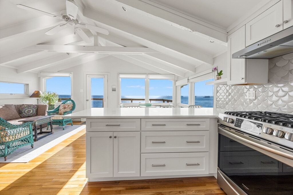 East End Waterfront Penthouse and Studio Annex — First Time on Market in 28 Years: This unique listing captures sweeping, unobstructed views of Long Point and the harbor, Pilgrim Monument, and the Provincetown skyline. Floor-to-ceiling windows fill the home with natural light and frame the ever-changing coastal panorama. The main level's penthouse great room impresses with a soaring cathedral ceiling, beautifully exposed beams, and warm hardwood floors. It creates a seamless flow for relaxing or entertaining with the water as your backdrop; step outside onto the rebuilt 160sf waterfront deck. A spacious high-end kitchen, a lovely bedroom and large foyer room complete this floor. Step downstairs to the studio annex for your updated bonus space for office, arts, workout and great views too. Be sure to see our photos; especially note a newly constructed top-notch seawall. A truly special opportunity to own a front-row seat to Provincetown's shoreline, rarely available and not to be miss