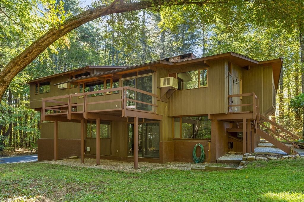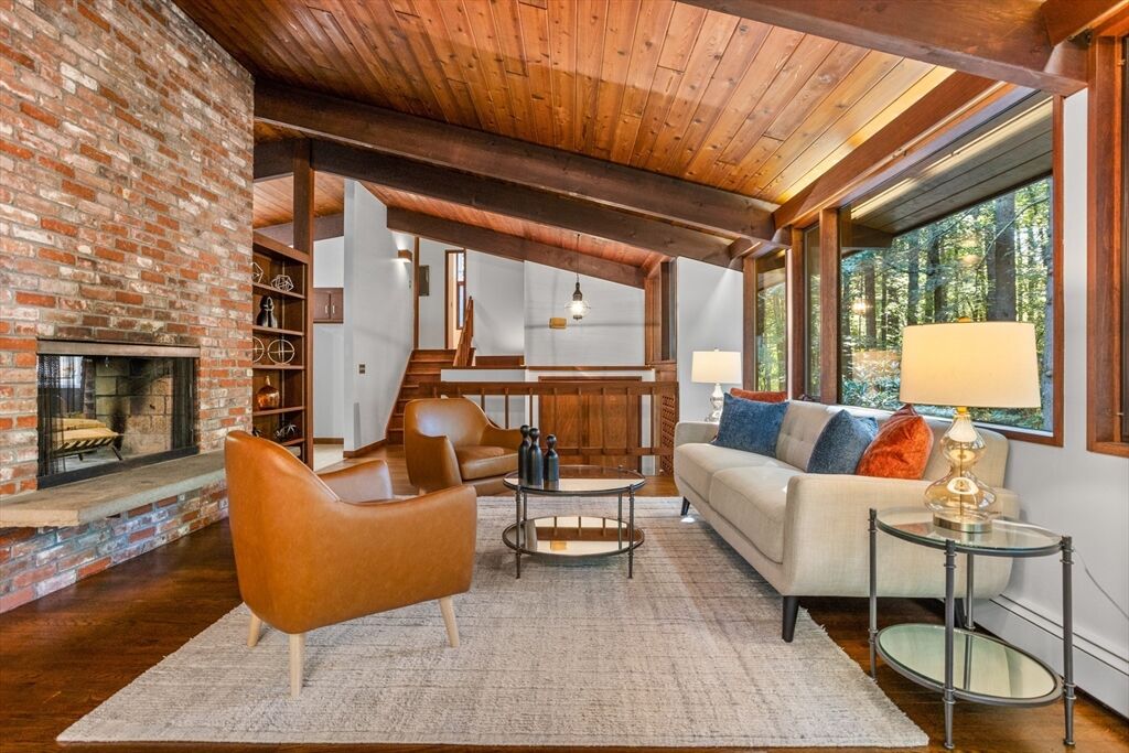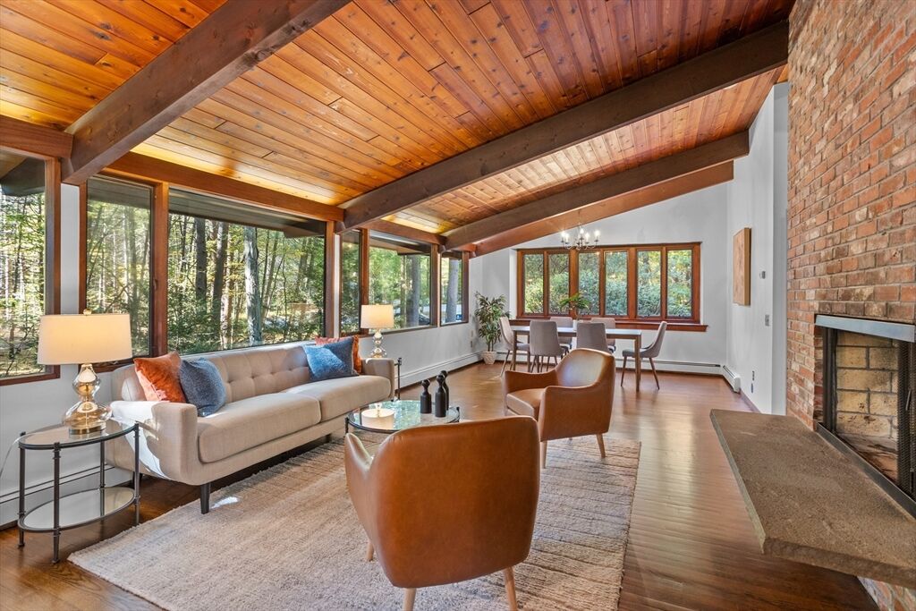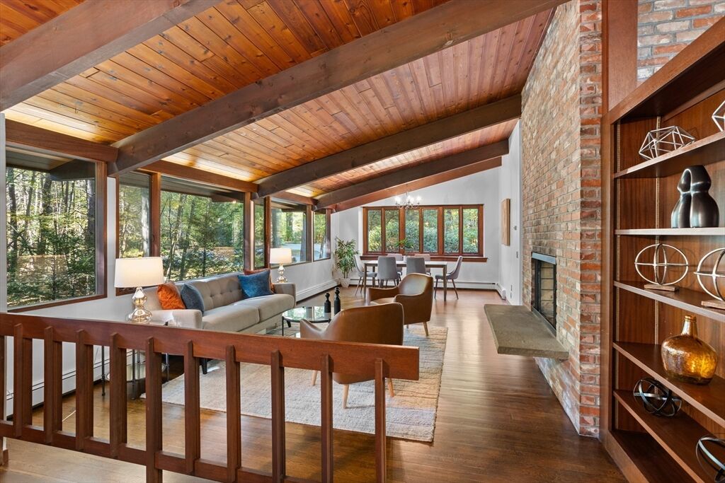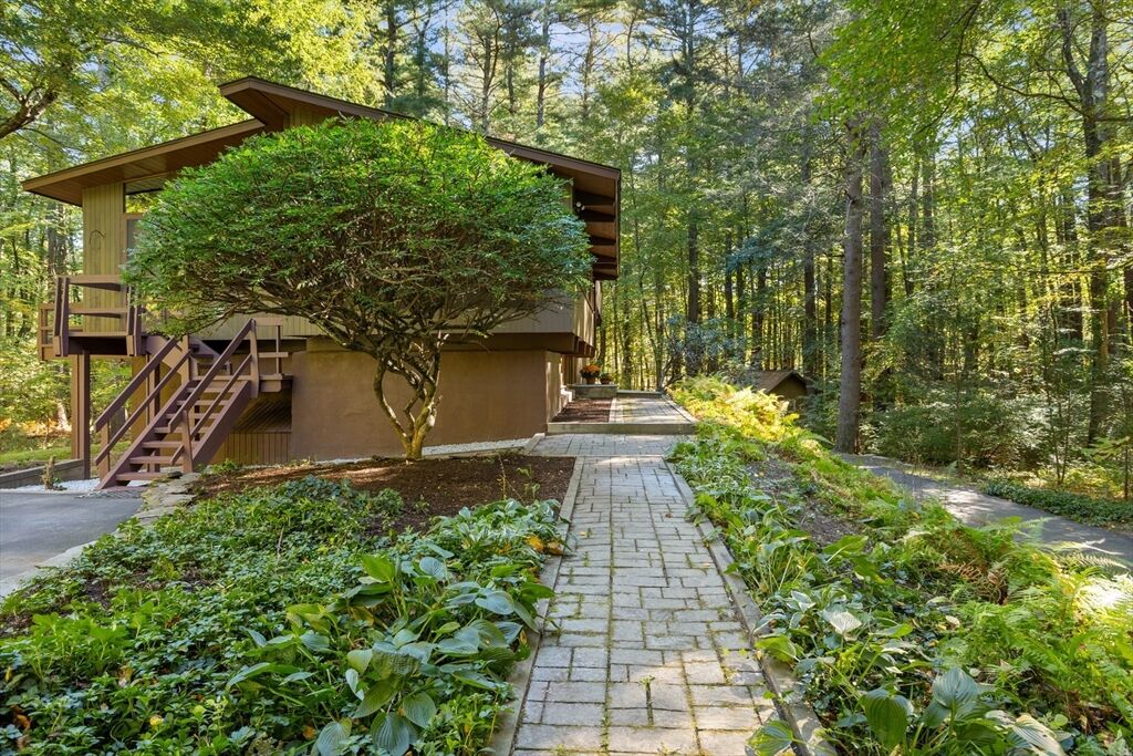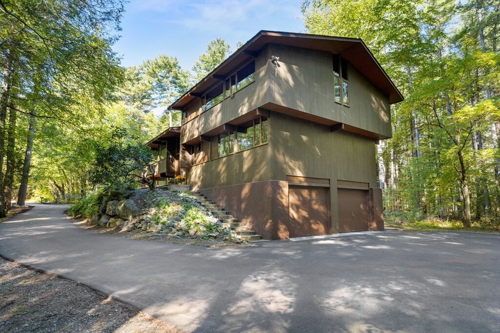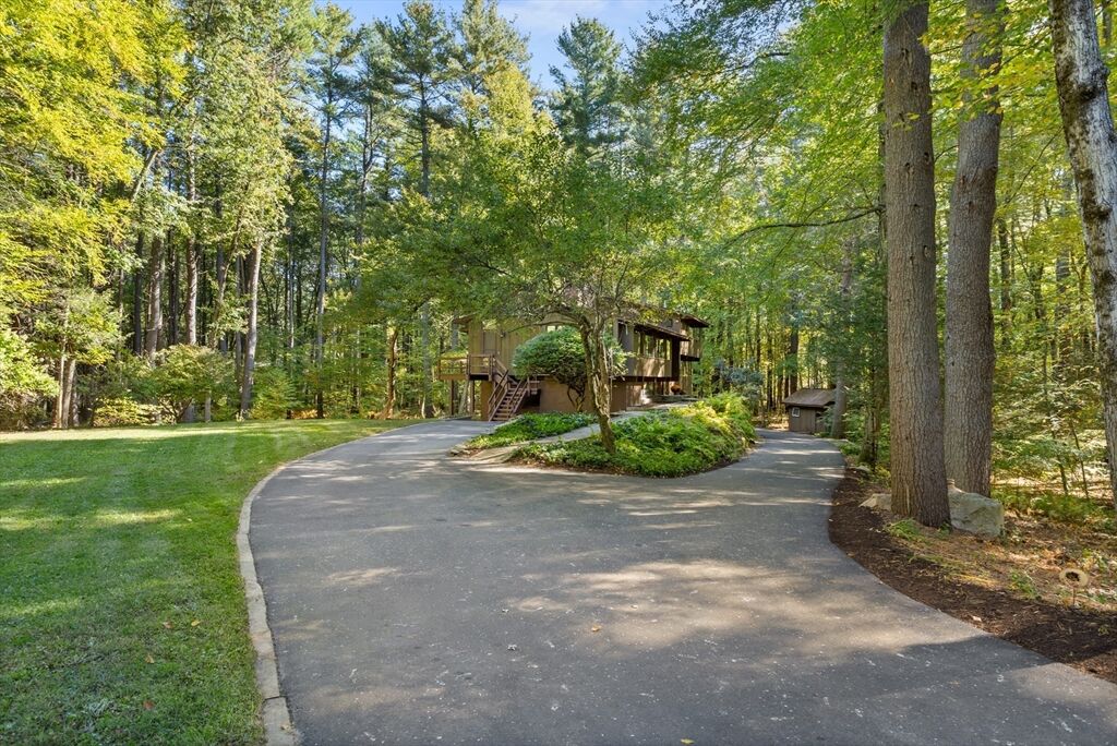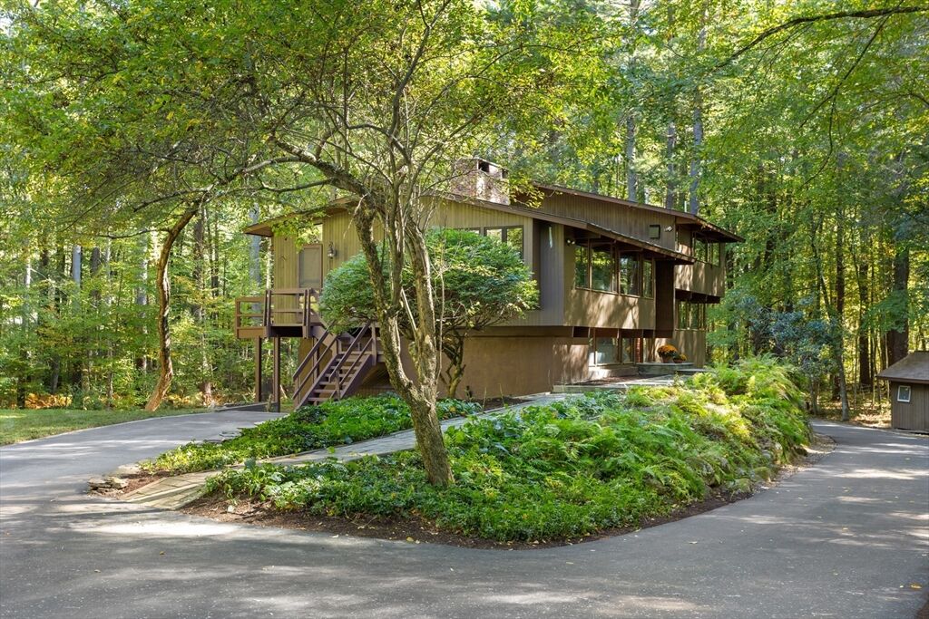 First time on the market! Tucked at the end of a quiet cul-de-sac on the Concord line, this custom-built post & beam Deck House offers a mid-century aesthetic w/soaring cedar ceilings, dramatic Douglas fir beams, rich mahogany millwork & cabinetry & walls of glass. Perched upon a private 2-acre lot among mature trees & views of nature from every window. Designed to bring the outside in, this spacious home offers an ideal layout for both gathering & quiet retreat, w/original features, as well as thoughtful upgrades. Cozy up by 1 of 2 double-sided fireplaces, host gatherings w/ease w/a versatile, open floor plan or on the large deck. 2-car-attached garage for ease of entry. Inside or out, this home invites you to enjoy the beauty surrounding you. Conservation land, trails & waterways are nearby for year-round outdoor escape. Timeless design & unbeatable location close to Carlisle, Concord & Bedford centers. This home offers a rare blend of serenity, privacy & convenience.