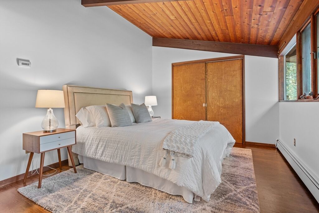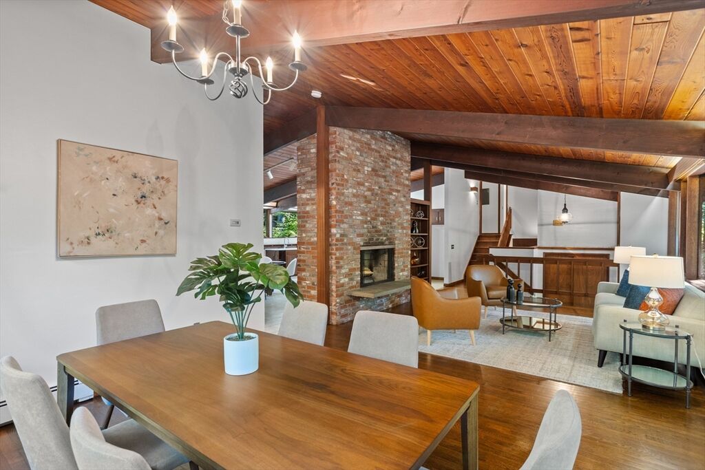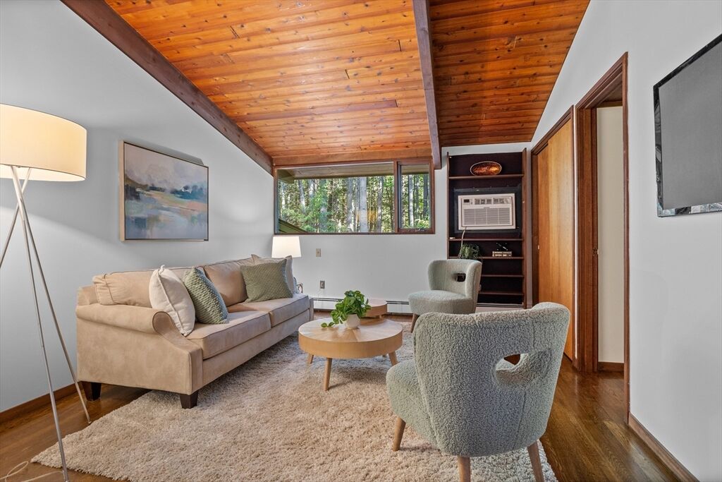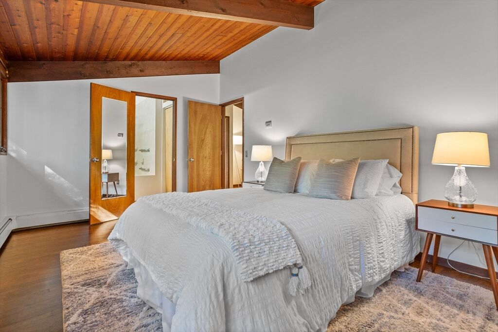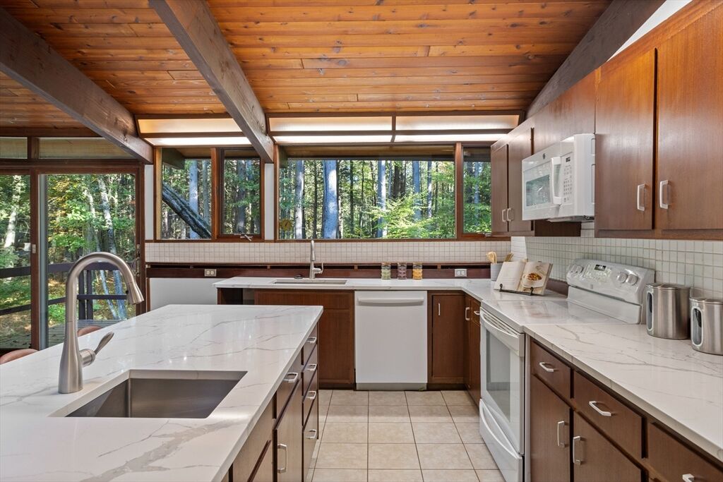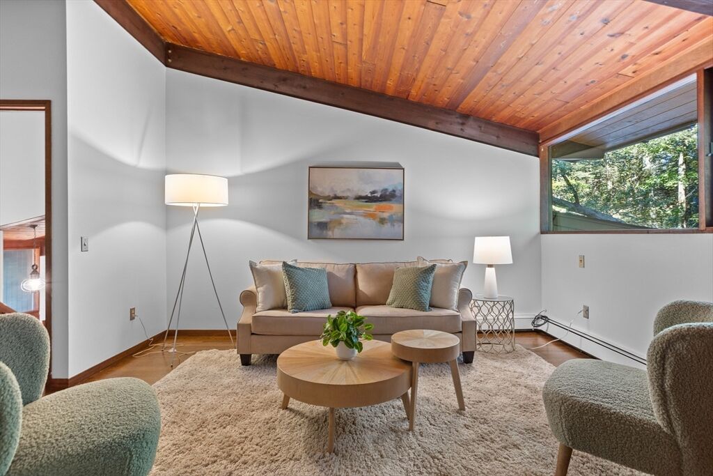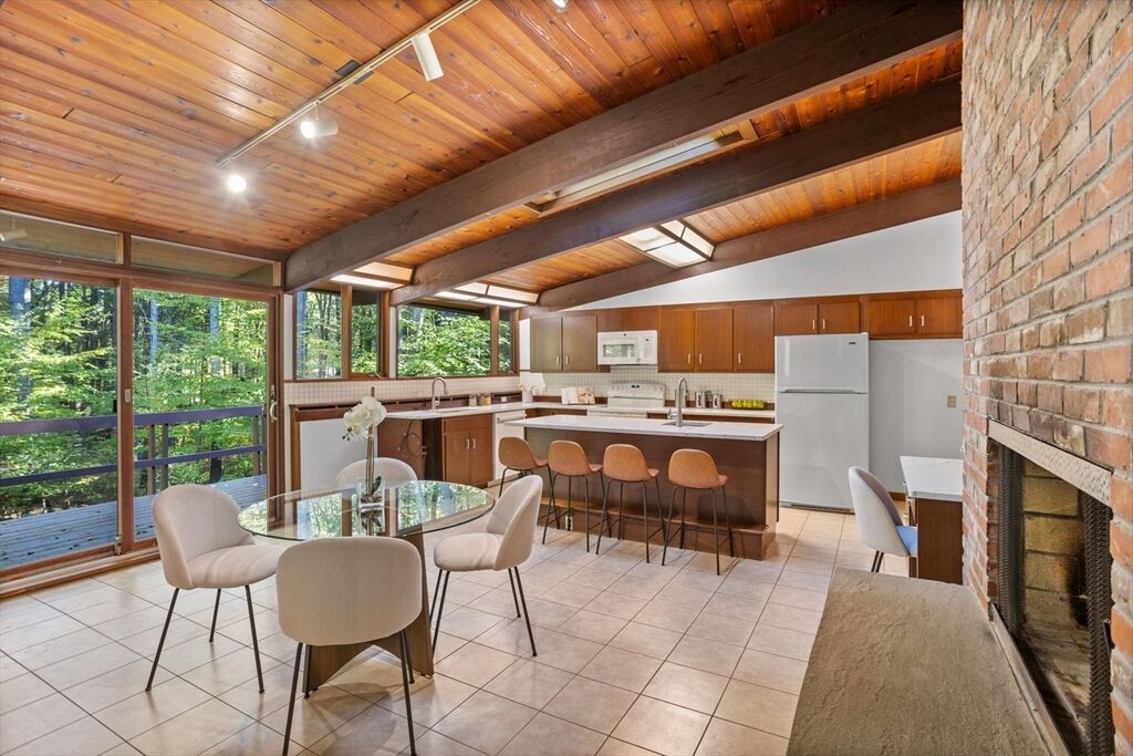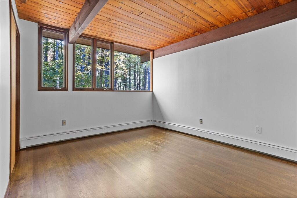 First time on the market! Tucked at the end of a quiet cul-de-sac on the Concord line, this custom-built post & beam Deck House offers a mid-century aesthetic w/soaring cedar ceilings, dramatic Douglas fir beams, rich mahogany millwork & cabinetry & walls of glass. Perched upon a private 2-acre lot among mature trees & views of nature from every window. Designed to bring the outside in, this spacious home offers an ideal layout for both gathering & quiet retreat, w/original features, as well as thoughtful upgrades. Cozy up by 1 of 2 double-sided fireplaces, host gatherings w/ease w/a versatile, open floor plan or on the large deck. 2-car-attached garage for ease of entry. Inside or out, this home invites you to enjoy the beauty surrounding you. Conservation land, trails & waterways are nearby for year-round outdoor escape. Timeless design & unbeatable location close to Carlisle, Concord & Bedford centers. This home offers a rare blend of serenity, privacy & convenience.