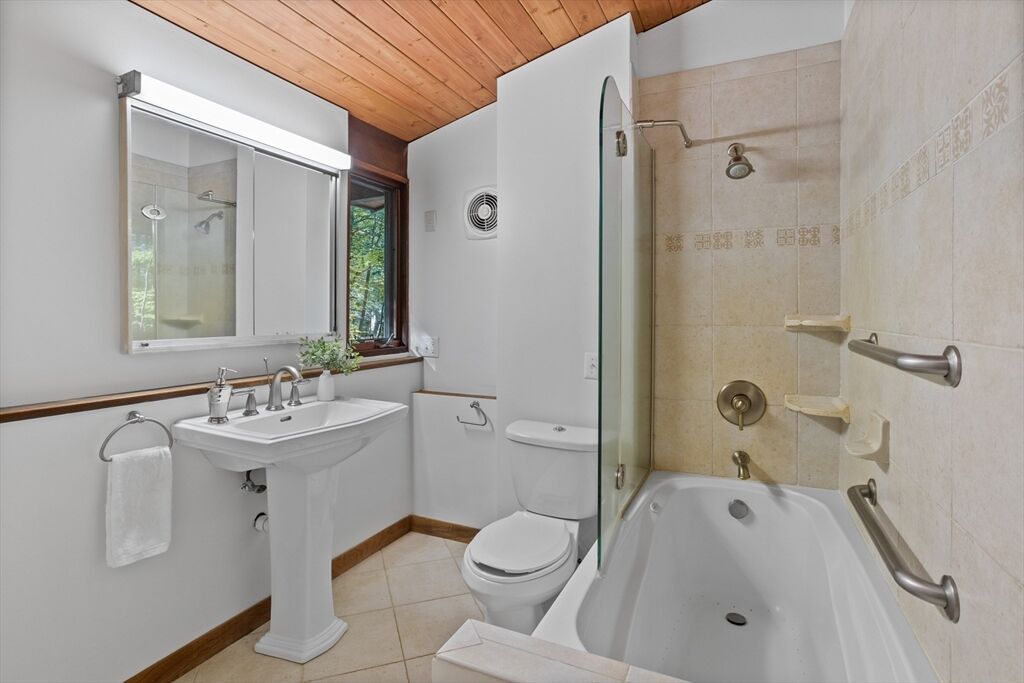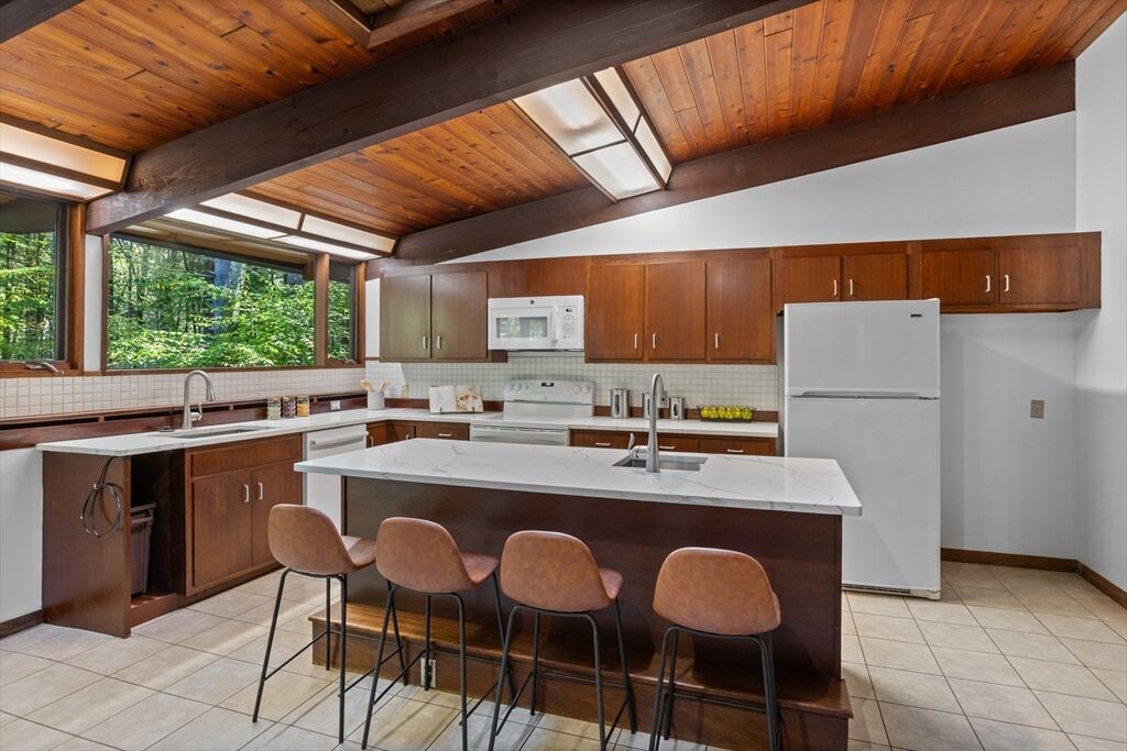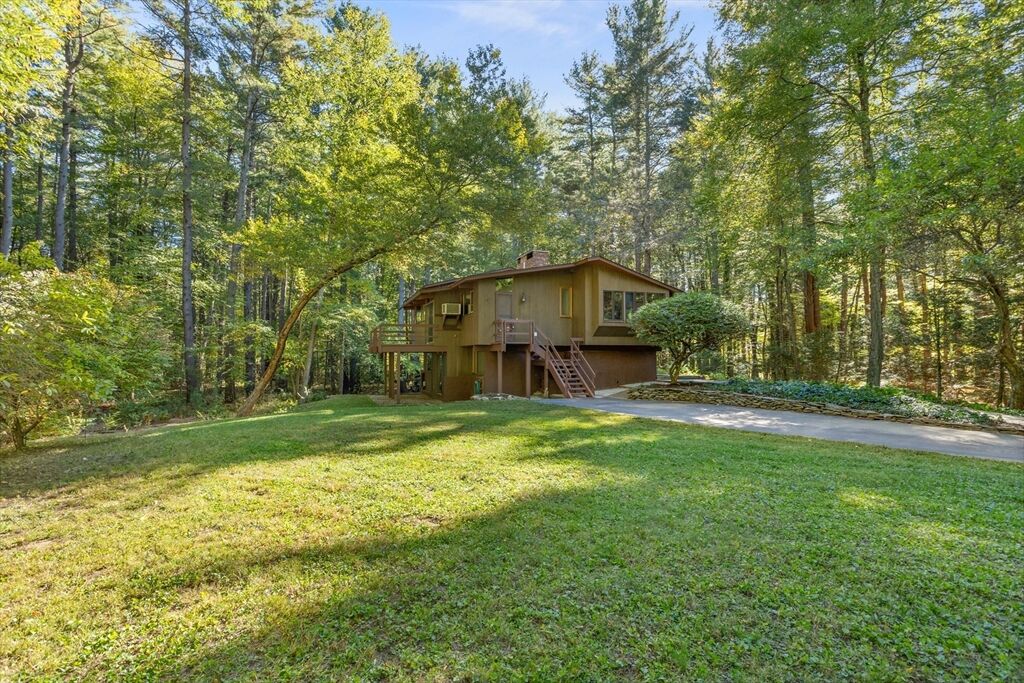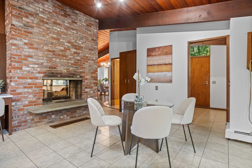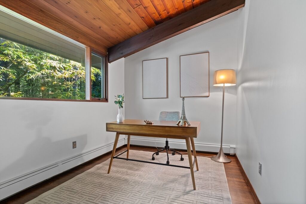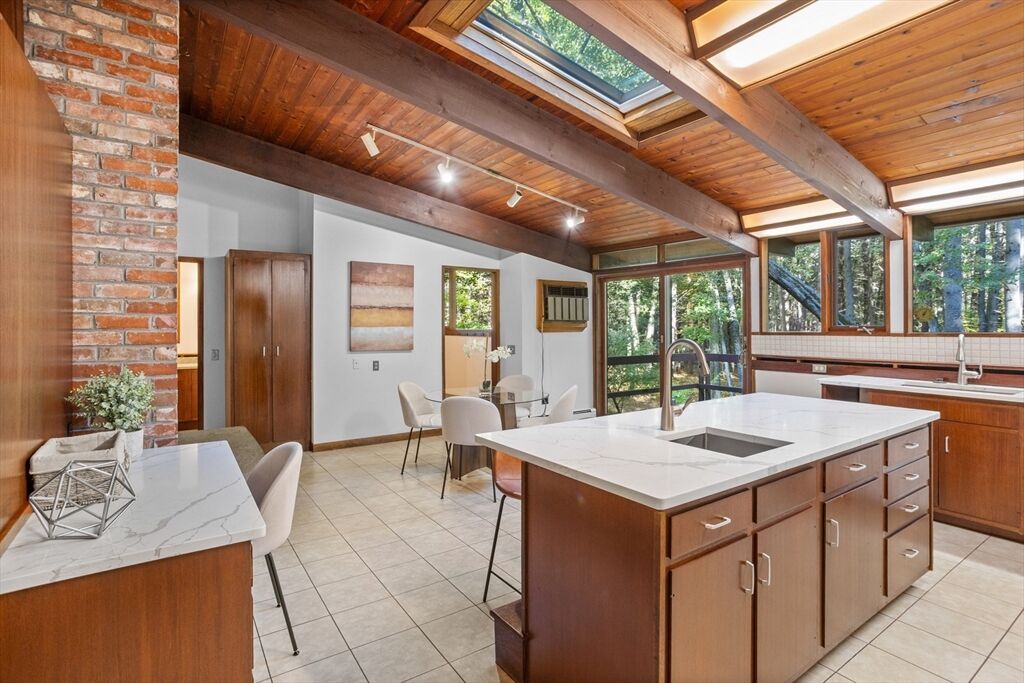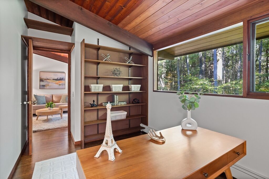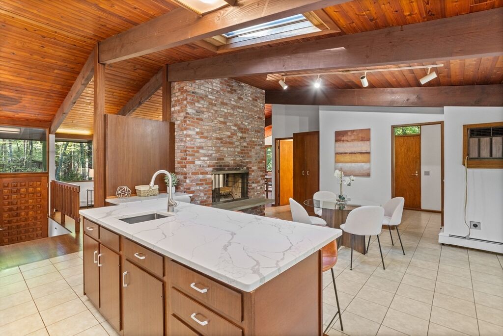First time on the market! Tucked at the end of a quiet cul-de-sac on the Concord line, this custom-built post & beam Deck House offers a mid-century aesthetic w/soaring cedar ceilings, dramatic Douglas fir beams, rich mahogany millwork & cabinetry & walls of glass. Perched upon a private 2-acre lot among mature trees & views of nature from every window. Designed to bring the outside in, this spacious home offers an ideal layout for both gathering & quiet retreat, w/original features, as well as thoughtful upgrades. Cozy up by 1 of 2 double-sided fireplaces, host gatherings w/ease w/a versatile, open floor plan or on the large deck. 2-car-attached garage for ease of entry. Inside or out, this home invites you to enjoy the beauty surrounding you. Conservation land, trails & waterways are nearby for year-round outdoor escape. Timeless design & unbeatable location close to Carlisle, Concord & Bedford centers. This home offers a rare blend of serenity, privacy & convenience.