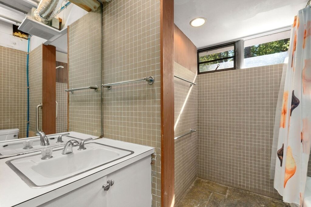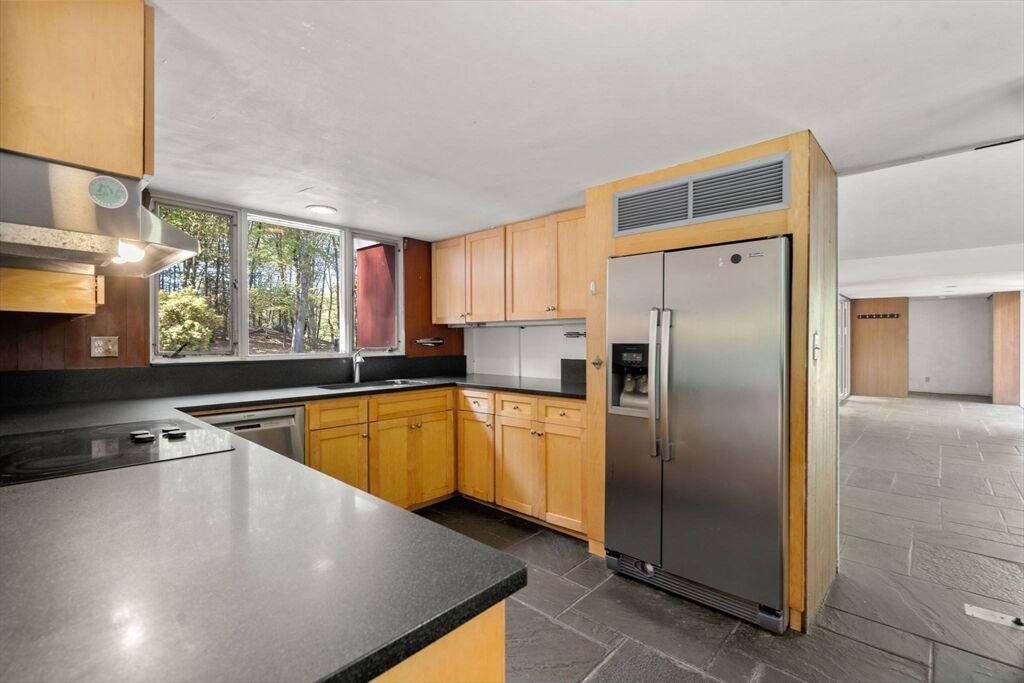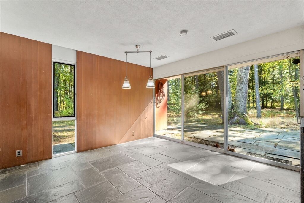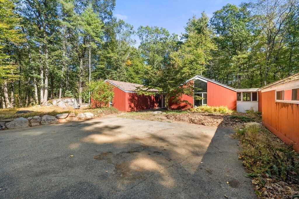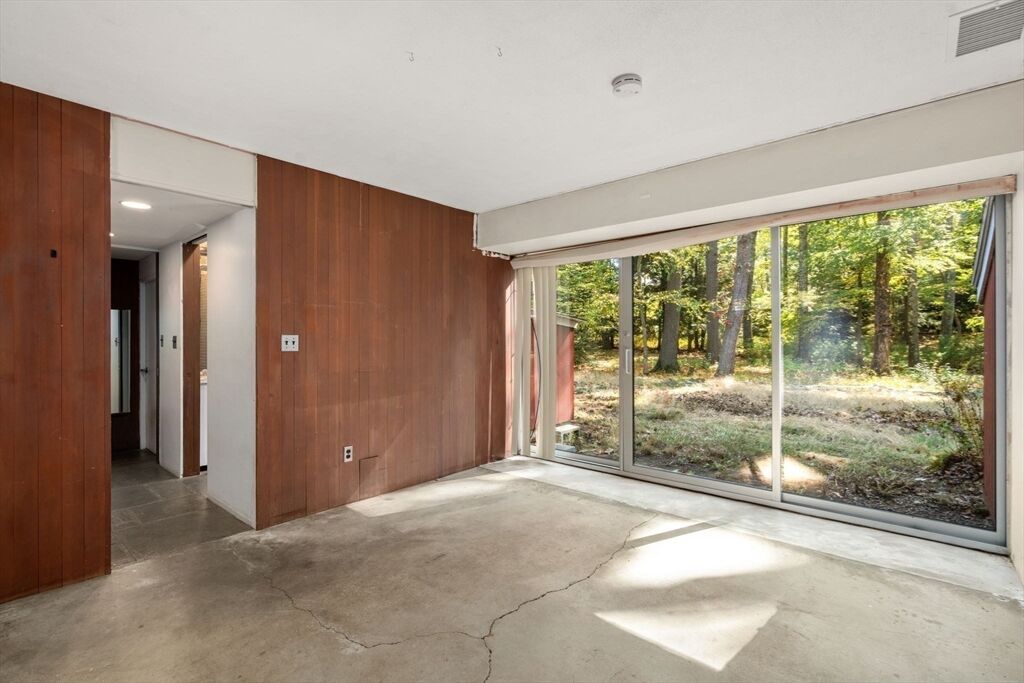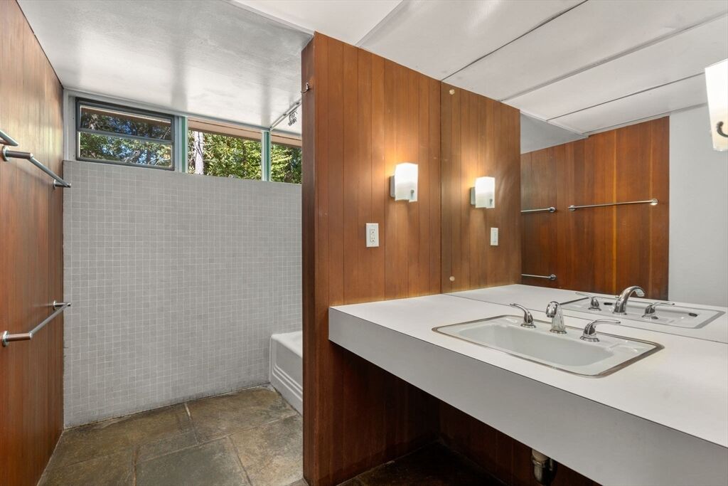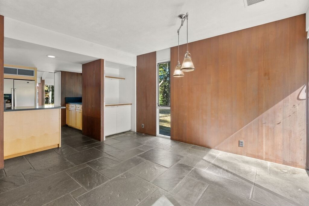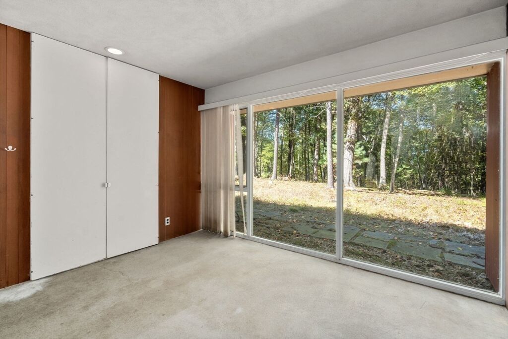 Quintessential Hoover & Hill-designed mid-century modern on an unspoiled five-acre lot. A perfect ecosystem of natural stone, trees, and open land – look for glacial erratics. The thoughtful 4-bedroom, 3-bath layout offers endless flexibility and is ideal for multi-generational families or an ADU. The courtyard layout allows each room a unique natural view. It has cathedral ceilings, stone floors, two fireplaces and copious built-in storage. Detached, oversized two-car garage/shop with electricity features two extra rooms, a storage loft, and potential for heating. Your separate office or studio? Located near the Gropius house, Carroll School, and DeCordova, it is a leisurely amble to Walden. This Mid-Century Modern residence maintains its integrity to the original architecture; however, this is a major project and is being offered as is, and is not in move-in condition. Title V to be provided by buyer. The drive is shared with the neighbor.