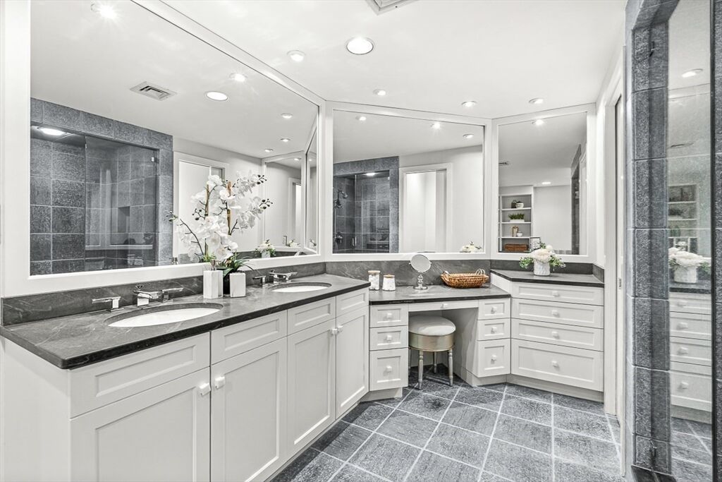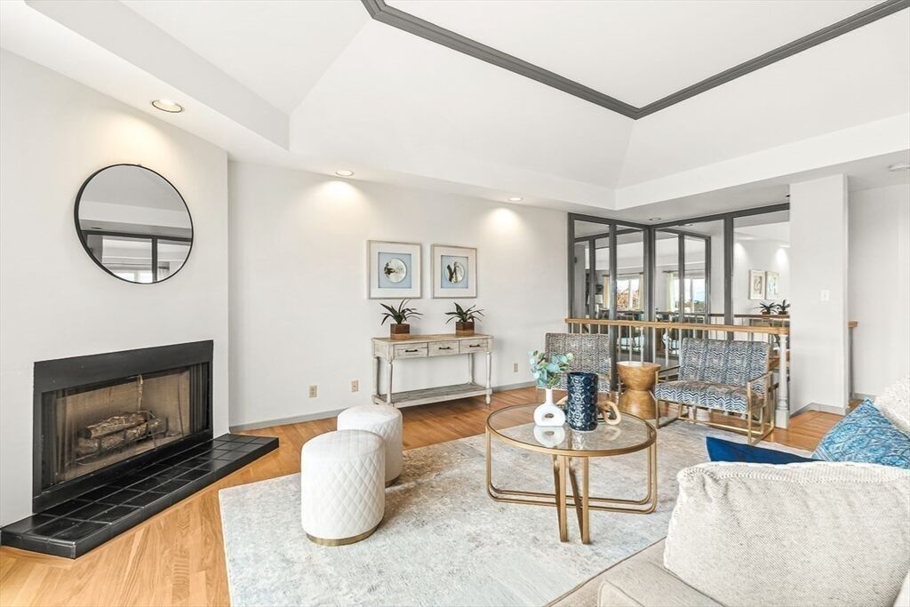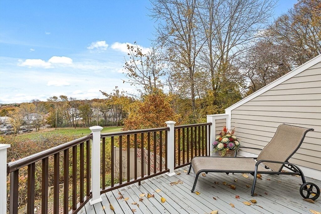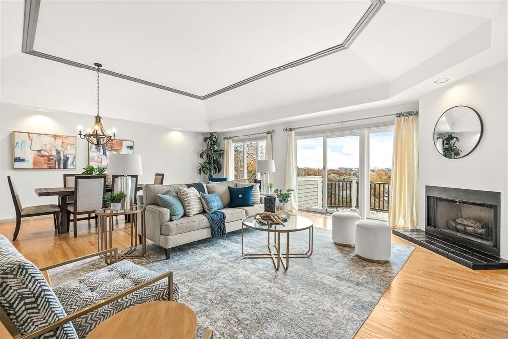 Tucked within the exclusive Fairways Condo Association you'll find a dramatic, sun-filled living experience. Enter through a terraced front patio & garden with roses & Japanese maple. The main floor features a generous foyer & open concept living/dining room with 10.5 ft ceilings, tray ceilings & slider to a balcony with a 180-degree views of the city skyline & Newton Commonwealth Golf Course. The eat-in kitchen boasts quartz counters & induction cooktop. The welcoming study has custom cabinets & a walk-in closet. Down a mirrored, glamorous stairwell is the expansive bedroom level. The elegant primary suite has 3 oversized closets & spa-like bathroom with jacuzzi tub & marble shower. Generous secondary bedroom, additional full bath & laundry complete this floor. Newer HVAC, building envelope & property refresh with sophisticated charm! Sliders from bedroom level wooded outdoors! A prime location offers easy access to Boston, the Green Line T, Chestnut Hill Reservoir & Boston College.