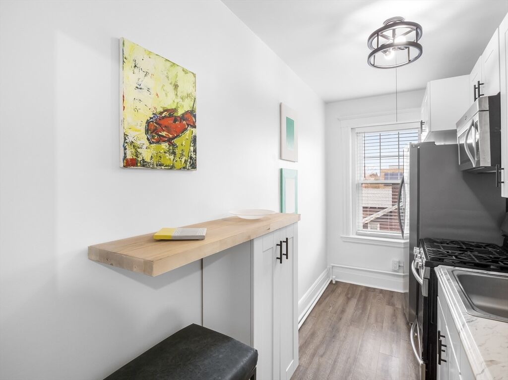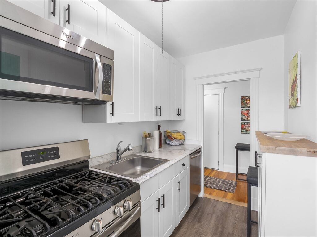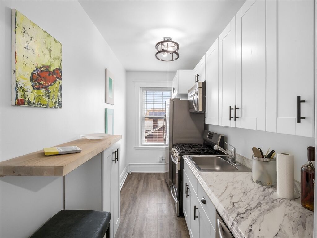A perfect opportunity to own a modern and inviting one-bedroom condo in Everett! Why pay rent when you can own this beautiful third-floor unit, featuring a spacious layout with modern finishes throughout. A beautiful kitchen includes a gas stove, microwave, dishwasher, refrigerator with water & ice maker, breakfast bar, and sleek cabinetry. The open living room offers plenty of space for both lounging and a dining area. Hardwood floors, with vinyl in the kitchen and tile in the bath. The full bathroom features a tiled shower and tub. A generously sized bedroom offers two closets, plus an additional coat and linen closet for extra storage. Coin-operated laundry is available in the basement. Conveniently located near Boston, Charlestown, Cambridge, Medford, and Revere—just minutes to Encore Casino, shops, restaurants, grocery stores, and public transportation, including bus routes and the Malden T Station.