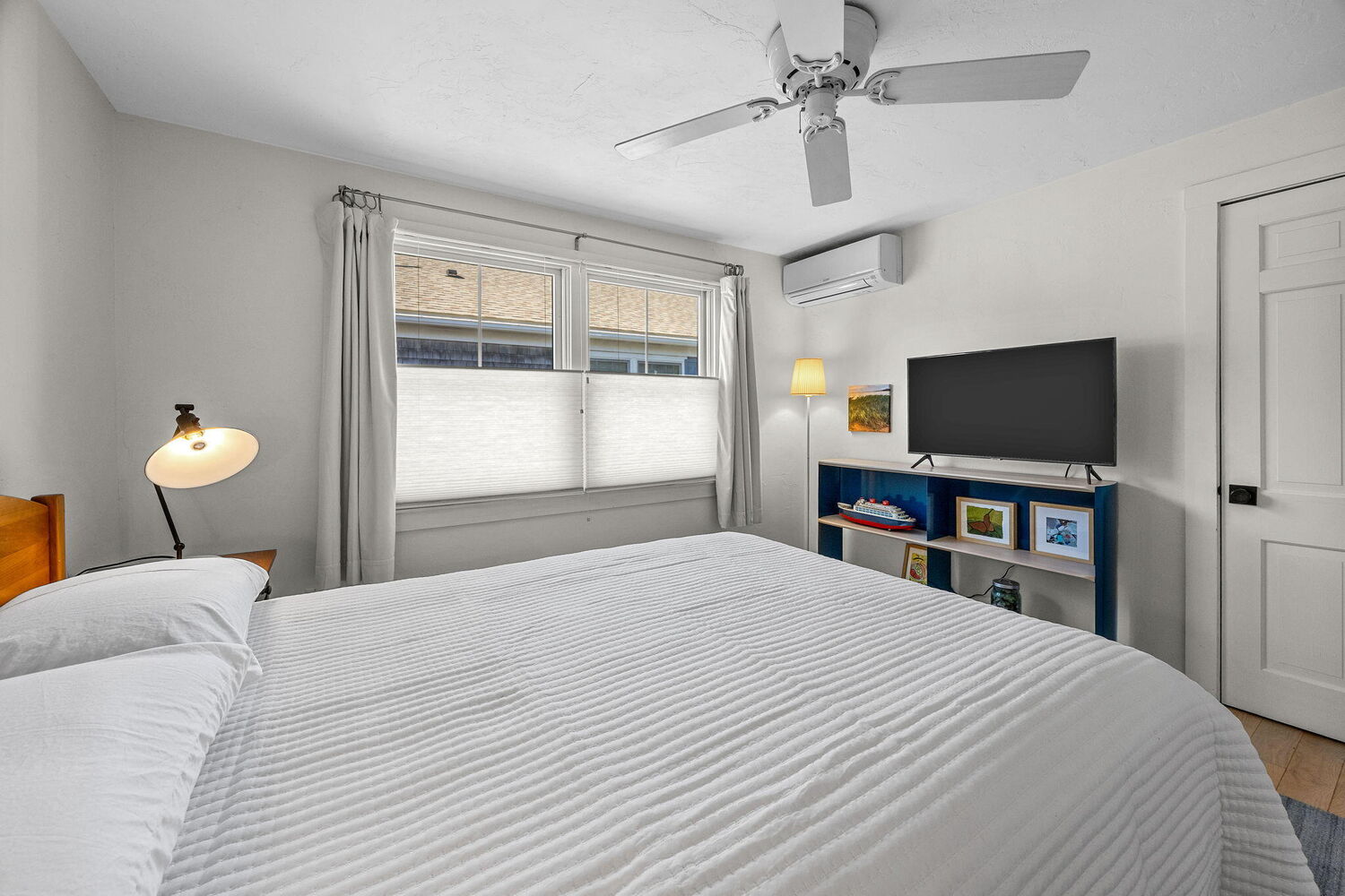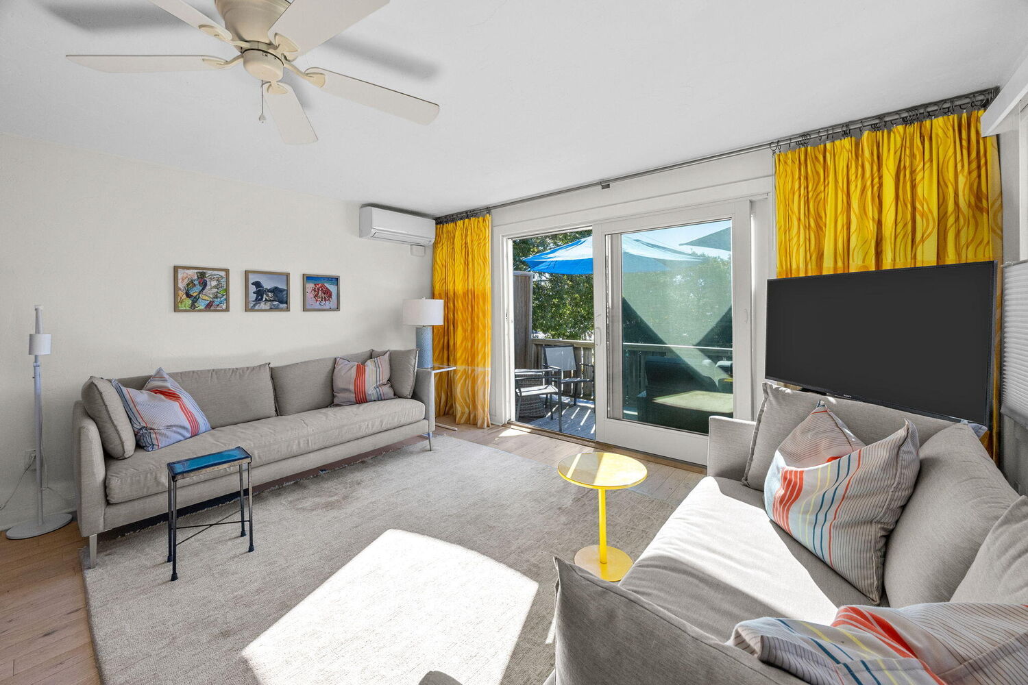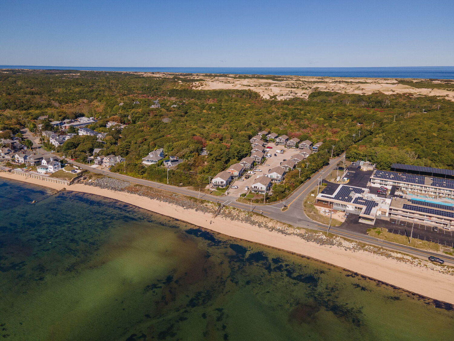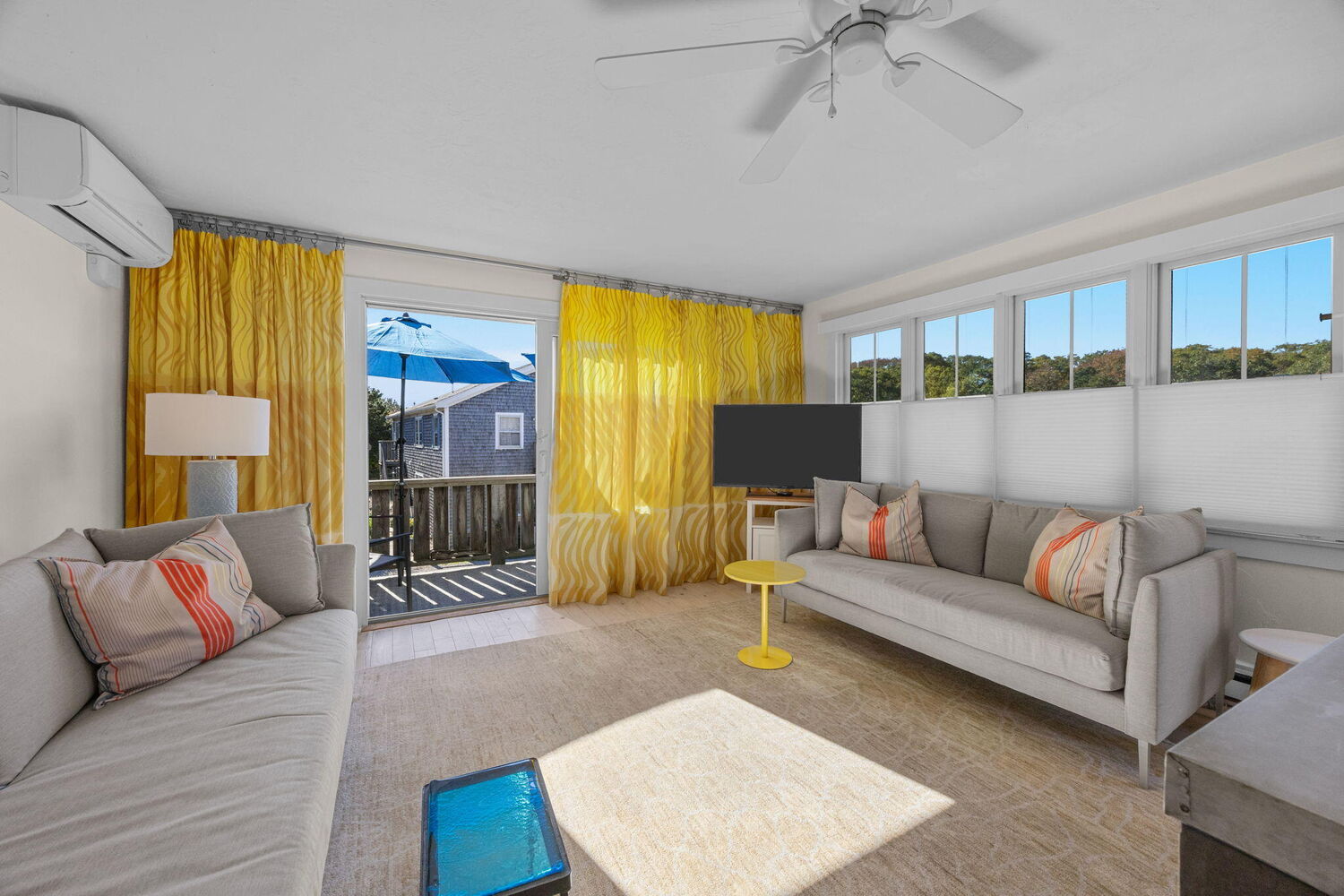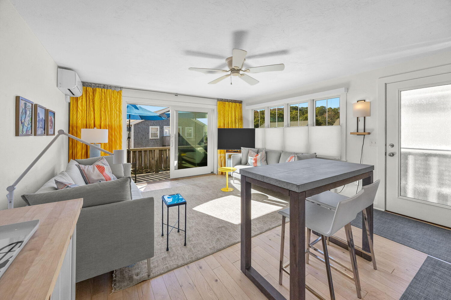 For those who dream of waking up near the beach and taking full advantage of all that Provincetown has to offer, this top-floor condo at Bay Colony is nothing short of magical. Whether it's heading to the heart of Provincetown's Gallery District or enjoying the nearby wooded Rail Trail, the location offers the perfect blend of coastal charm and natural serenity. Sunlight pours into this bright, well-maintained unit, located in a quiet four-unit building. Thoughtfully updated over the years, the current owners have invested in comfort and style--replacing windows and the sliding patio door, upgrading kitchen cabinetry, countertops, and appliances, renovating the bathroom, installing new wood flooring throughout, and adding efficient split AC/heat units in every room. Even better, brand-new siding is on its way--and assessment fully paid for--making this a truly turn-key opportunity. Step inside to an open-concept living, dining, and kitchen area that leads out to a sunny deck--ideal for morning coffee or evening beverages. The kitchen features stone countertops and a full suite of modern appliances, perfect for entertaining or a quiet night in. Down the hallway, you'll find a beautifully renovated full bathroom complete with a soaking tub, custom white subway and blue glass tilework, and a sleek contemporary vanity. Both bedrooms are generously sized to accommodate king beds, offering flexibility and comfort. The rear bedroom enjoys tranquil views of a wooded landscape. Additional perks include a deeded parking space, guest parking for the association, and dedicated storage for the unit in the basement along with this unit's own washer and dryer. But perhaps best of all there is exclusive beach access Here, postcard-worthy views of Provincetown Harbor and Truro await. Whether you're seeking a year-round residence, a weekend escape, or a savvy investment, this Provincetown Bay Colony gem offers the best of Cape Cod living-sun, sea, and the trails in between. (Buyer to assume sewer betterment. Seller welcomes Offers with requests for Buyer concessions.)