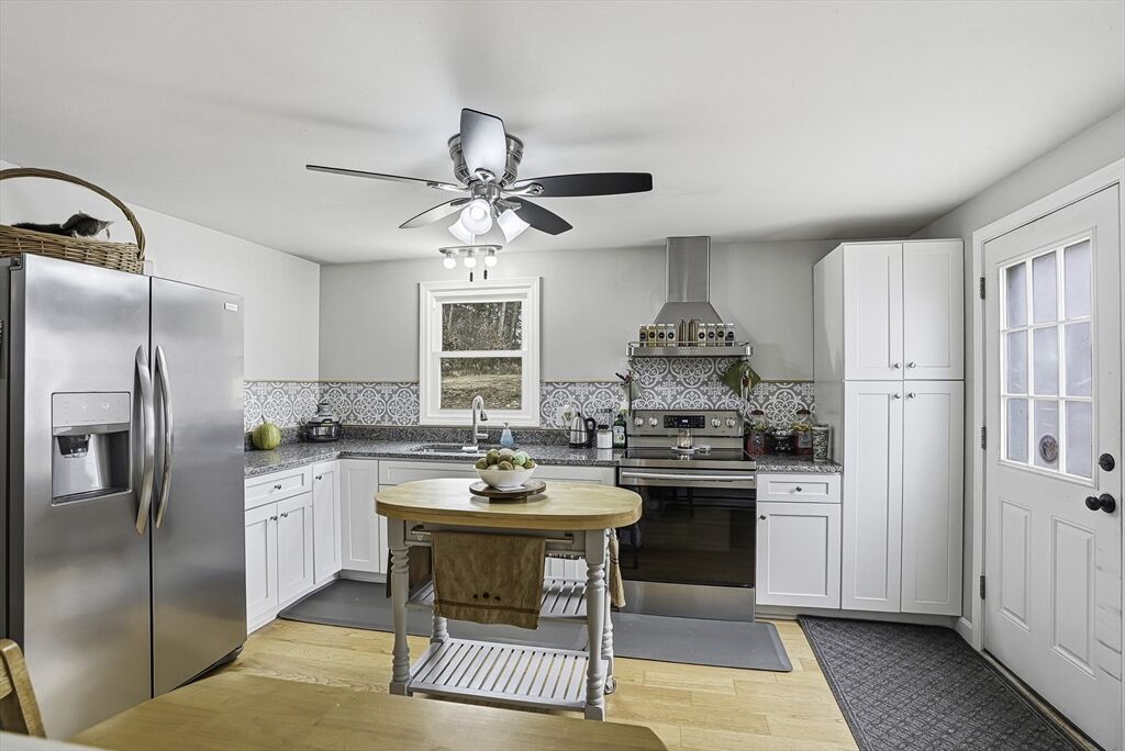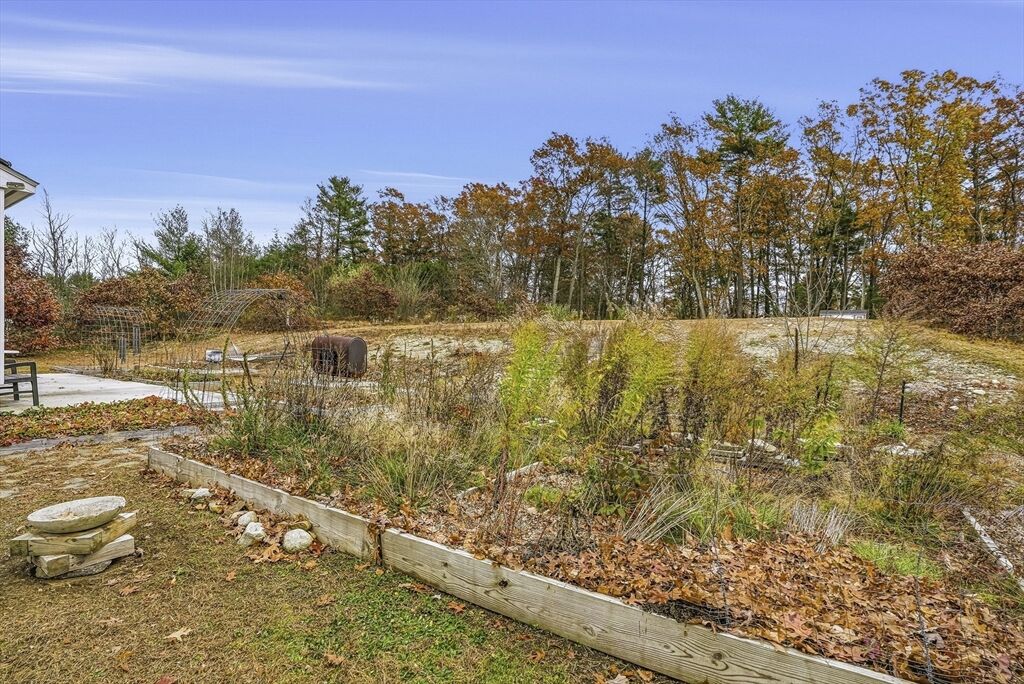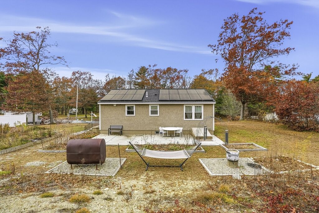 Perched high off the road for privacy, this warm & well-kept ranch offers comfort & charm on a large, level yard. Well-rooted perennial flowers & organic fruit beds surround the home, complemented by a stone pathway, concrete patio, & a 10x12 storage shed for all your outdoor needs. Inside, luxury engineered wood floors flow throughout the main level. The sunny eat-in kitchen features upgraded cabinetry, granite counters, a pantry cabinet & stainless steel appliances—all included. Unwind in the relaxing full bath with a deep porcelain clawfoot tub, double-bowl vanity, & tile flooring. Two spacious bedrooms complete the main floor. The mostly finished lower level, fully heated by a pellet stove, includes a cozy family room, laundry area, & bonus room with a closet—ideal for a bedroom, guest space, office, or gym. New septic tank just installed! Eco-friendly solar panels & a convenient location complete this inviting home.