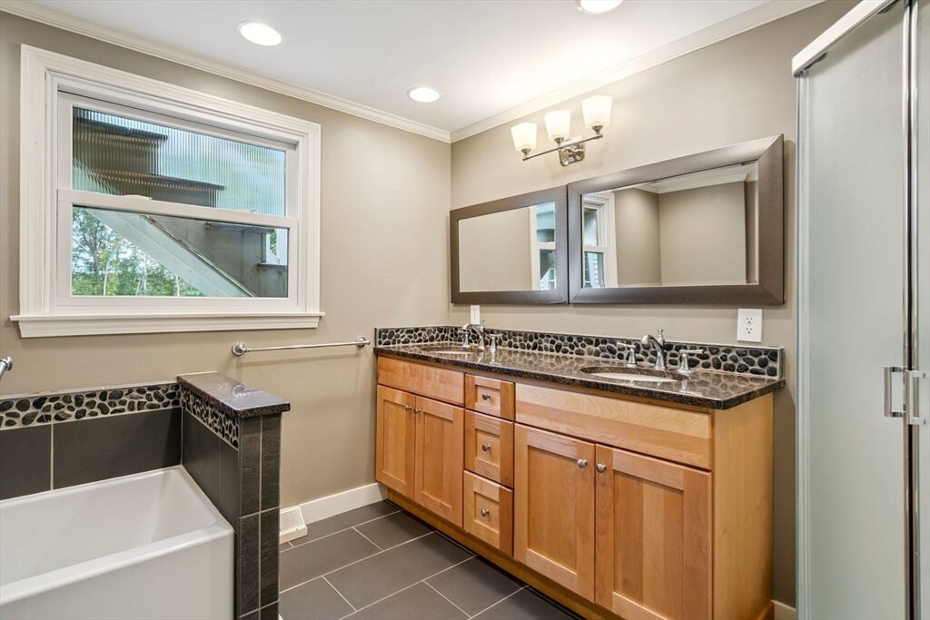 Versatile living in a gorgeous one acre setting on a dead end street. Enter from the middle patio into the kitchen/dining/living area complete with granite counters,SS appliances,HW floors and warmly painted cabinets. The fire place is surrounded by custom bookshelves. The pellet stove warms the dining room and surrounding. A grand cathedral ceiling family room leads out to a post and beam screened porch for summer time gatherings. Delight in the birds and manicured garden in the level back yard.Down the hall an updated bathroom with a soaking tub, shower stall and twin sinks. A pocket door separates the commode. Two ample bedrooms on the first floor with large closets. The basement has a finished laundry room,bathroom and bonus room with a cedar closet. Above the garage with its own entrance is another room with a 1/4 bath and wood stove. The second floor is a legal one bedroom apartment complete with its own driveway and laundry. This listing is also listed as a single MLS#73434571