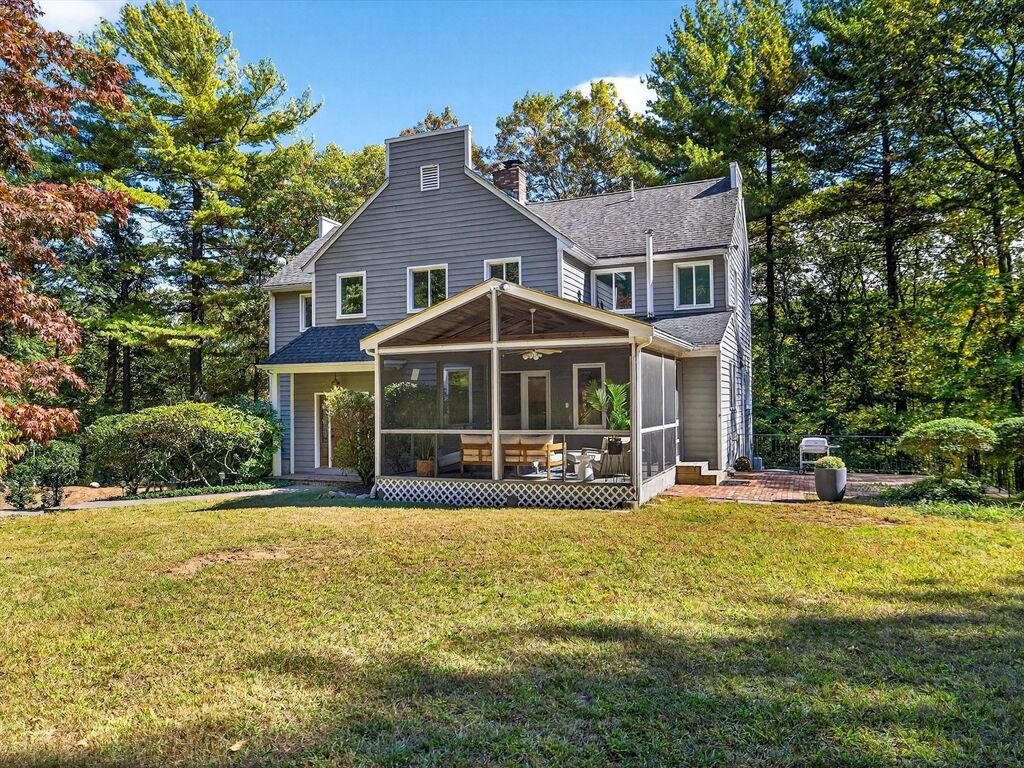 Tucked away on nearly 2 private acres and surrounded by lush greenery, this contemporary colonial feels like a serene woodland retreat, yet it’s just minutes from the heart of Wayland. The open-concept kitchen flows into a welcoming family room, with an adjacent dining room perfect for entertaining. A sunken living room with dramatic windows floods the space with light and offers peaceful, tree-filled views. The first-floor office adds work-from-home ease, while upstairs, the luxurious primary suite features a spa-like bath, vaulted ceilings, walk-in closet, and Juliet balcony. Three additional bedrooms and laundry complete the second floor. The finished walkout lower level includes a home gym and flexible living space. Enjoy indoor-outdoor living on the oversized screened porch and new brick patio - ideal for relaxing, entertaining, and soaking in the quiet, natural setting. A true private oasis.