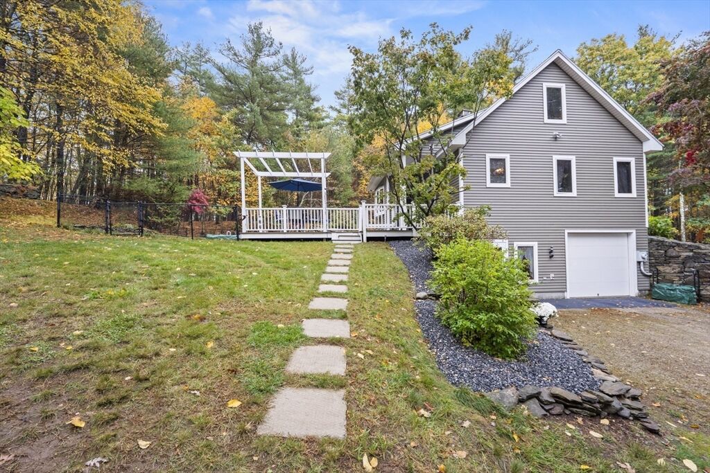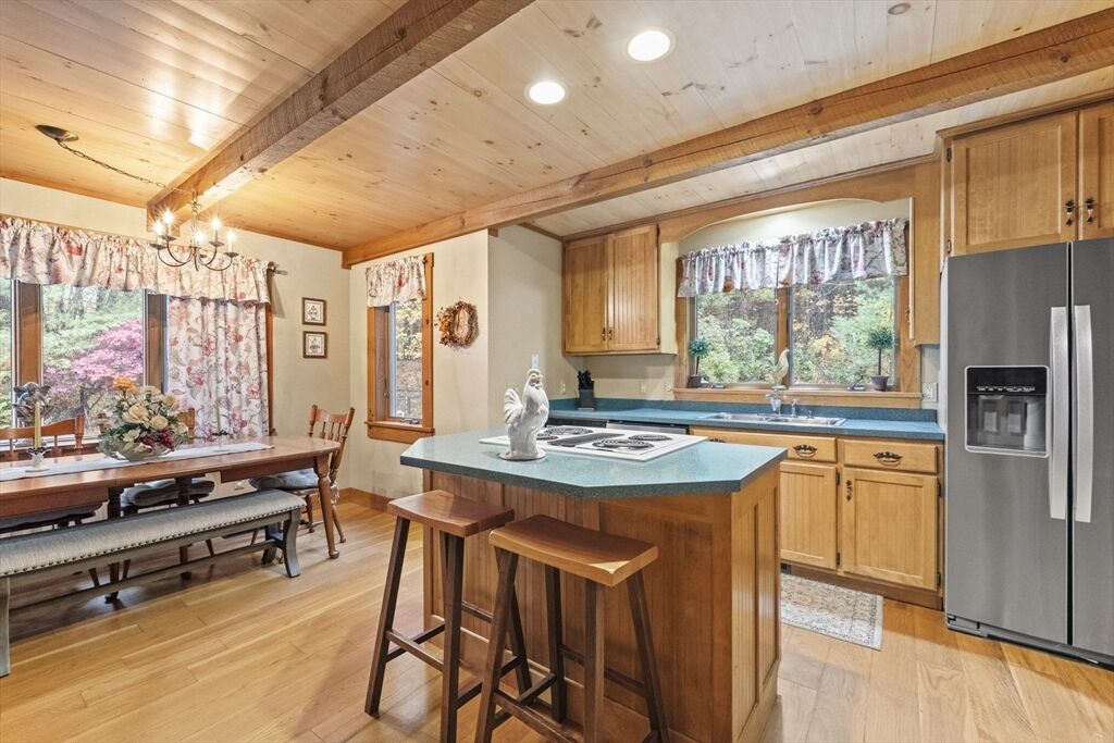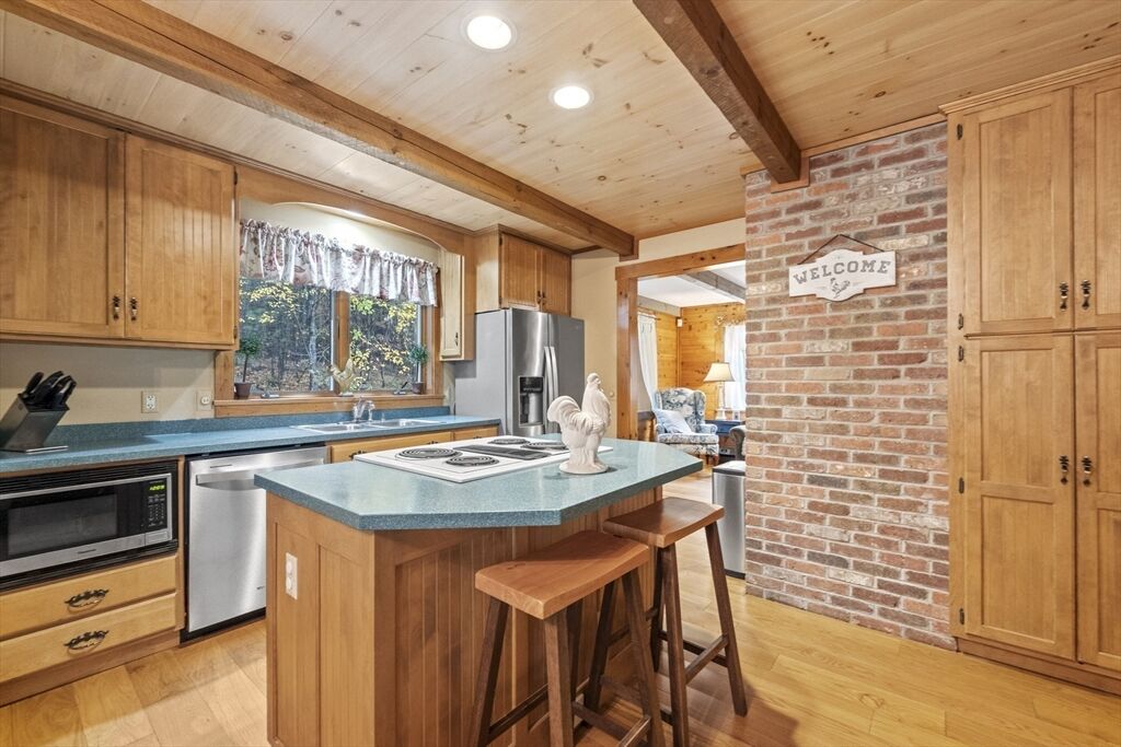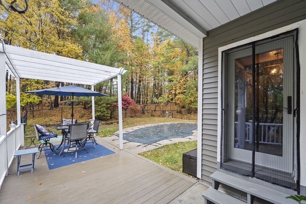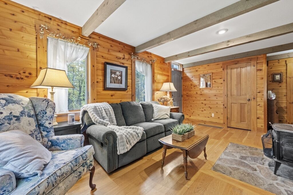 Tucked away from the road on a dead-end street, and surrounded by trees, this charming Cape offers privacy and comfort in a beautiful natural setting. Inside, you’ll find a spacious living room featuring a floor-to-ceiling accent wall with a wood stove, hardwood floors, and a beamed ceiling with wood-paneled walls for a warm, rustic feel. The kitchen includes stainless steel appliances, a center island, dining area, and tons of cabinet space. A first-floor bedroom and a full bath complete the main level, while the second floor offers two additional bedrooms. Enjoy outdoor living with a fenced yard with sprinkler system, in-ground pool, and covered deck — perfect for relaxing or entertaining. Additional highlights include an attached garage, storage shed, and plenty of off-street parking for convenience and ease. Enjoy crisp fall evenings by the fire or sunny summer days by the pool!