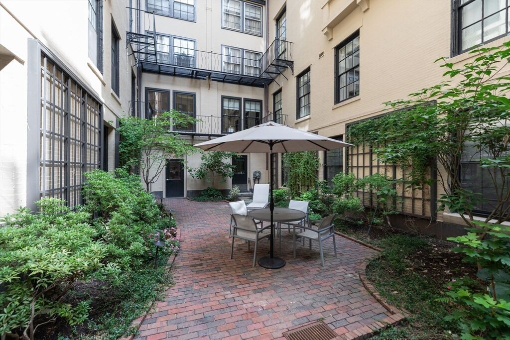 A-plus location. On upper Mt. Vernon Street is this spacious two-bedroom, one and a half bath garden level unit. Enter through a foyer with coat closet leading to an enormous living/dining room with parquet floor, built-in display cabinet with storage, and windows overlooking a charming, landscaped courtyard. U-shaped kitchen off foyer with wood cabinets, granite counters and pass-thru to the living room. Two bedrooms. Common outside areas include a pleasant courtyard and a beautiful roof deck with the most spectacular and far-reaching views of Boston. Located in an impressive pair of twin brownstone mansions circa 1840 on the Mt. Vernon Street side and a former chapel on the Chestnut Street side, this is an opportunity to customize the unit to your own standards in one of the most impressive building complexes on the Hill. Live-in superintendent, exercise room, professionally managed association.