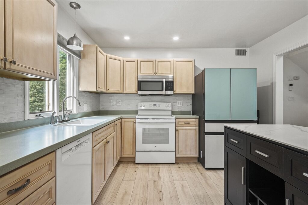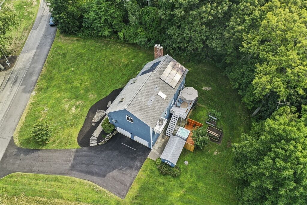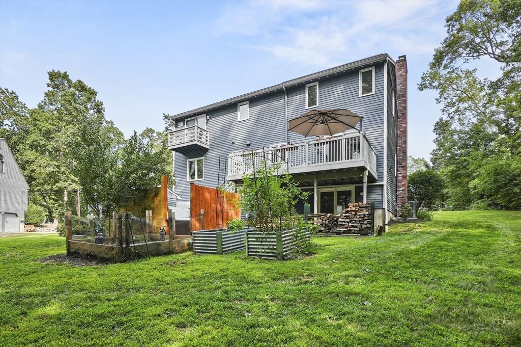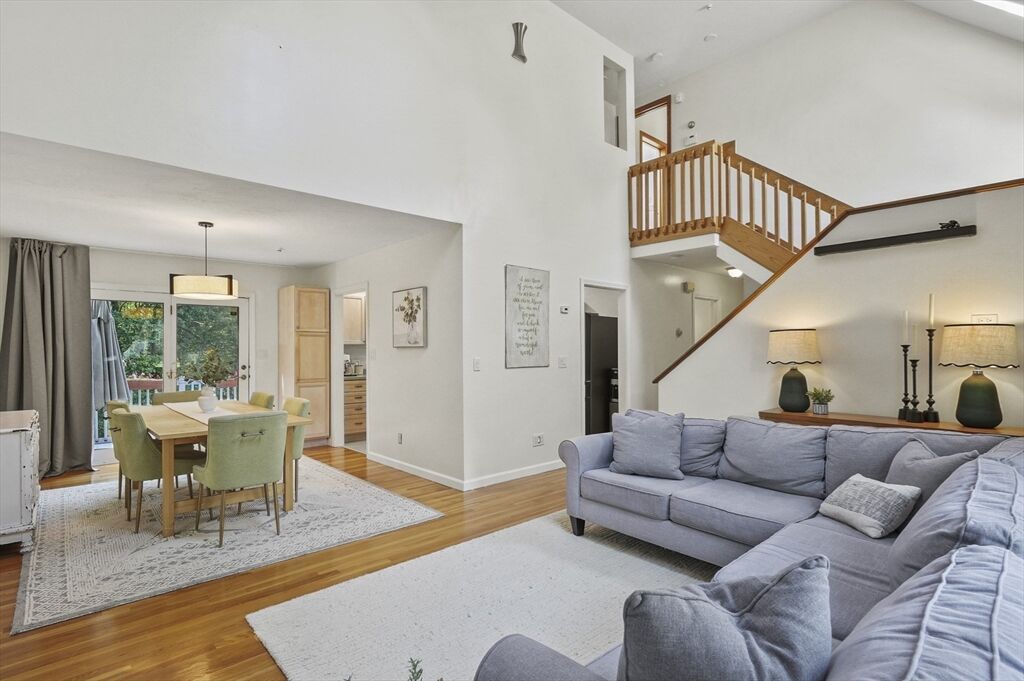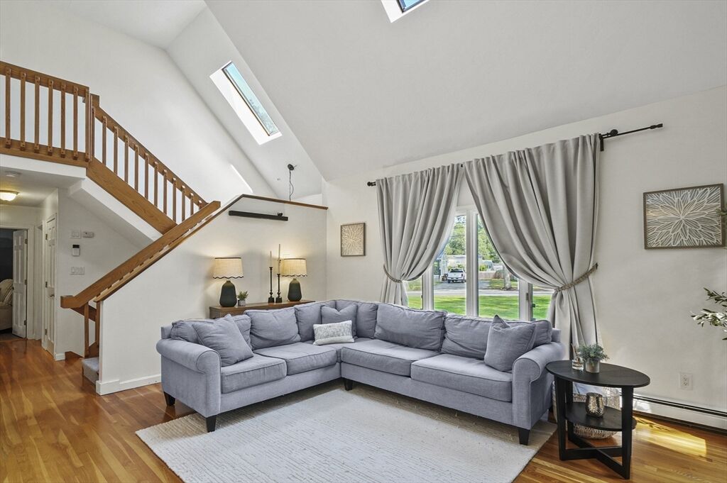 Step inside this revitalized contemporary Cape! The sun-drenched, open-concept living & dining area is spectacular, vaulted ceiling w/skylights pours in warmth & light, all complemented by a cozy wood stove. The bright dining room flows seamlessly out to the back deck. In the kitchen, you'll find newer appliances & sleek recessed lighting. Two spacious bedrooms w/ample closets & full bath are down the main hall. Upper level is a private retreat: primary suite boasts a vaulted ceiling w/skylights, walk-in closet & updated bath with modern amenities. Step onto your private balcony to unwind with the peaceful sounds of nature. 4th bedroom has multiple windows finishes this floor. The lower level offers a versatile bonus room with half bath & slider that lead directly to the backyard. Enjoy tree-lined privacy, relaxing hot tub & wooden privacy fence, storage shed, along with spacious back deck. Superbly located just minutes from conservation trails, T-station, Tufts Vet School & dog park!
