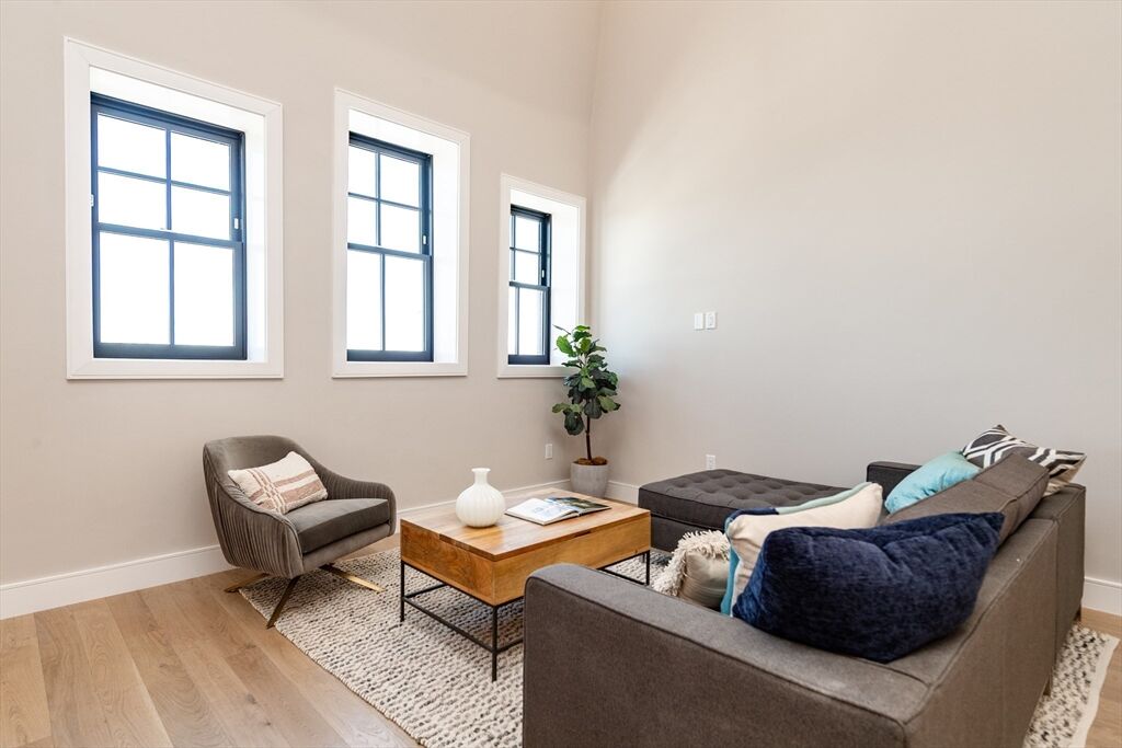 THIS LOFT IS AWESOME! Located in a converted 1890’s Queen Anne building dubbed Allston Hall, with easy access to Harvard + BU, this top floor loft has two levels of living space and 18' ceilings! An entry foyer leads to a dramatic open floorplan living, dining + kitchen area with distinct Palladian windows. Finishes throughout have a crisp + modern feel w/engineered oak floors and a contemporary white + gray kitchen w/Bosch appliances and a large seating island. The bathroom boasts large format wall tiles, hexagon floor tiles, a soaking tub + matte black Kohler fixtures. There is also an office nook on this floor. Upstairs is a spacious mezzanine level bedroom overlooking the floor below. It features a walk-in closet + laundry. The building has an elevator + rental parking included for the first year. Conveniently located near everything that Allston has to offer including the T, shopping, restaurants and more. ONE OF ONLY TWO UNITS REMAINING!