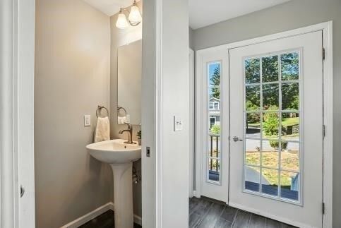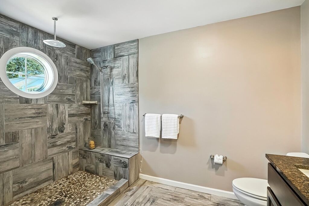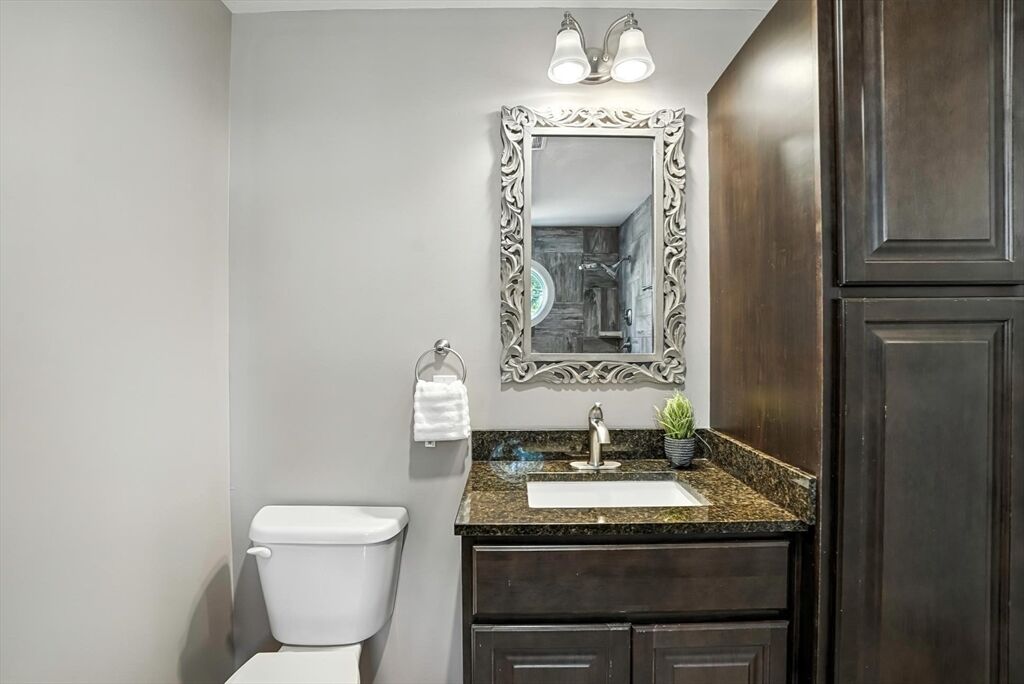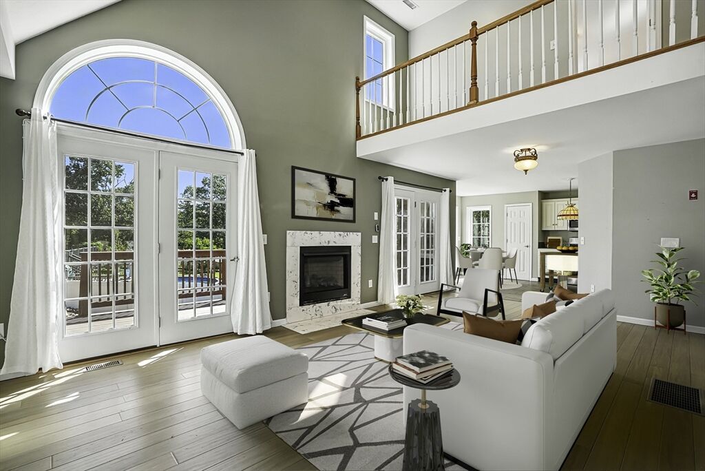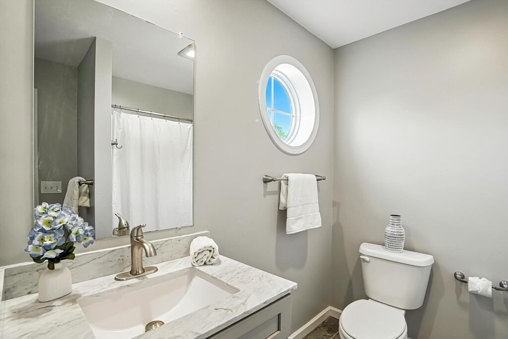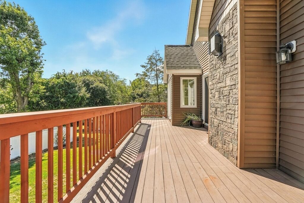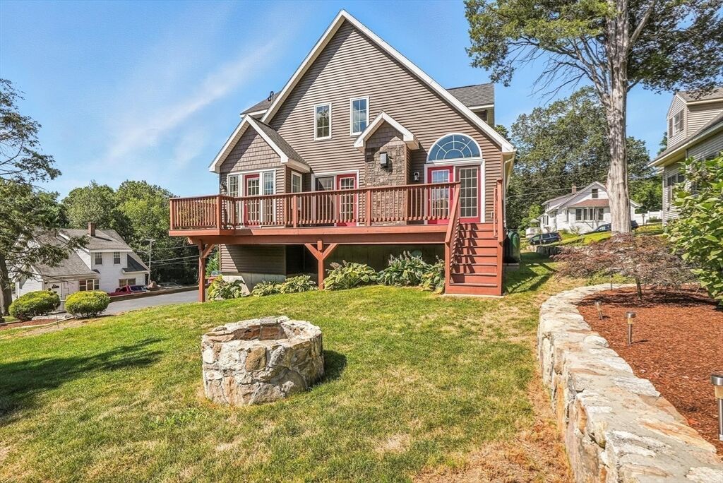 Modern charm meets timeless design in this stunning 3-bedroom, 2.5-bath Contemporary Cape, just 7 years young. The open-concept layout features a sun-filled living room with hardwood floors, vaulted ceilings, gas fireplace, and access to a spacious deck. The stylish kitchen offers granite countertops and stainless-steel appliances, while the first-floor primary suite includes a walk-in closet and spa-like bath with an oversized shower. Upstairs, a bright landing—perfect for a home office—leads to two generous bedrooms and a full bath. The basement provides excellent storage and finishing potential. Enjoy outdoor living on the expansive deck overlooking the backyard and stone firepit. Conveniently located near highways, shopping, and parks, this home is move-in ready and waiting for you!
