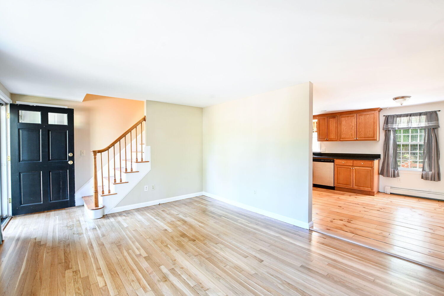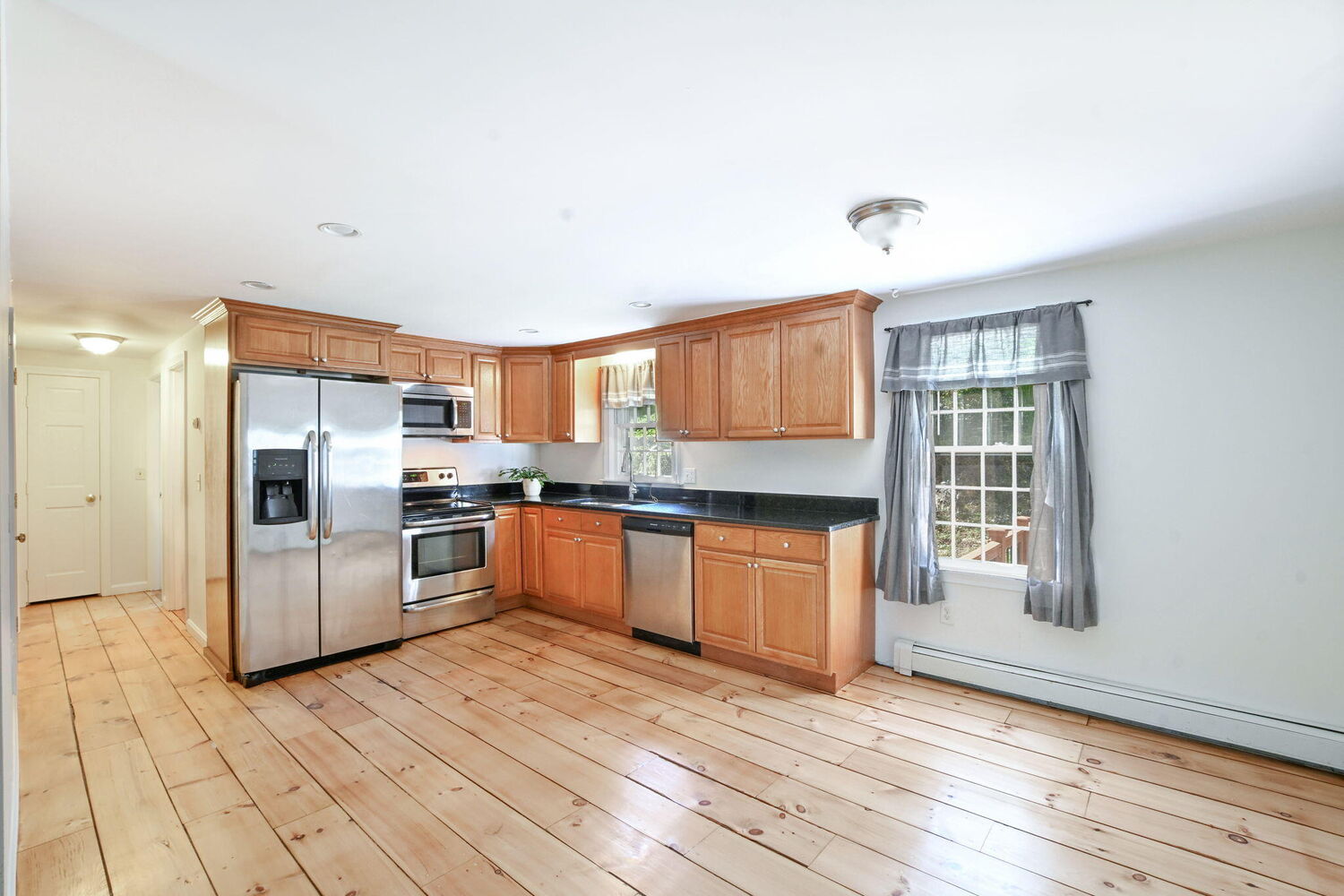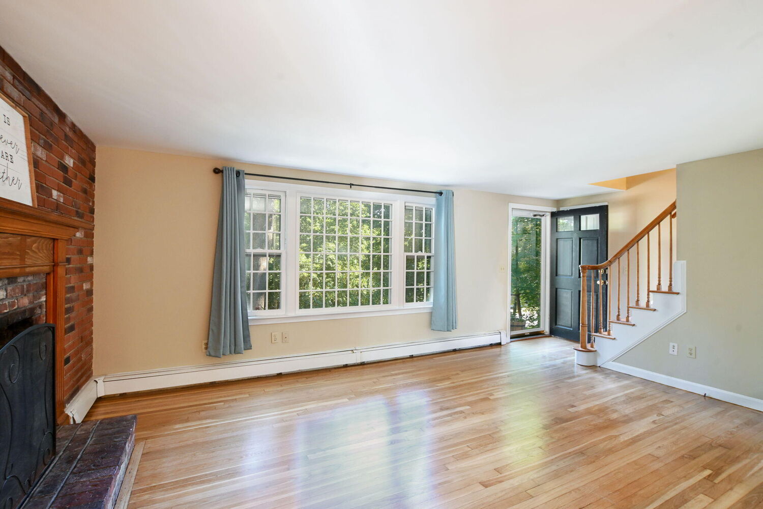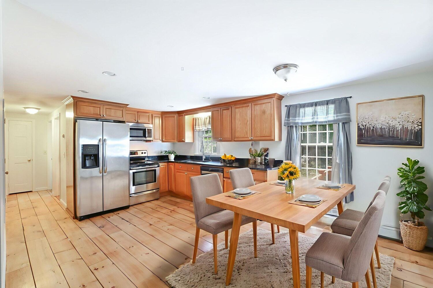 Snuggled in a neighborhood on a quiet side street off Main Street for peaceful living yet near all the amenities needed within two miles of home - shopping, restaurants, bike path, beach, marina, library. Ready to settle in? The main level features open kitchen/dining with wide pine floors, wood cabinets and stainless appliances - fireplaced living room - two bedrooms (or bedroom and office) - full bath. Upstairs are front to back bedroom and additional two rooms plus full bath. 7 total rooms/4 BR - wood floors throughout - enclosed breezeway with slider to patio - attached oversized garage -paved driveway - full basement. A lot to offer in a great location under $600,000.