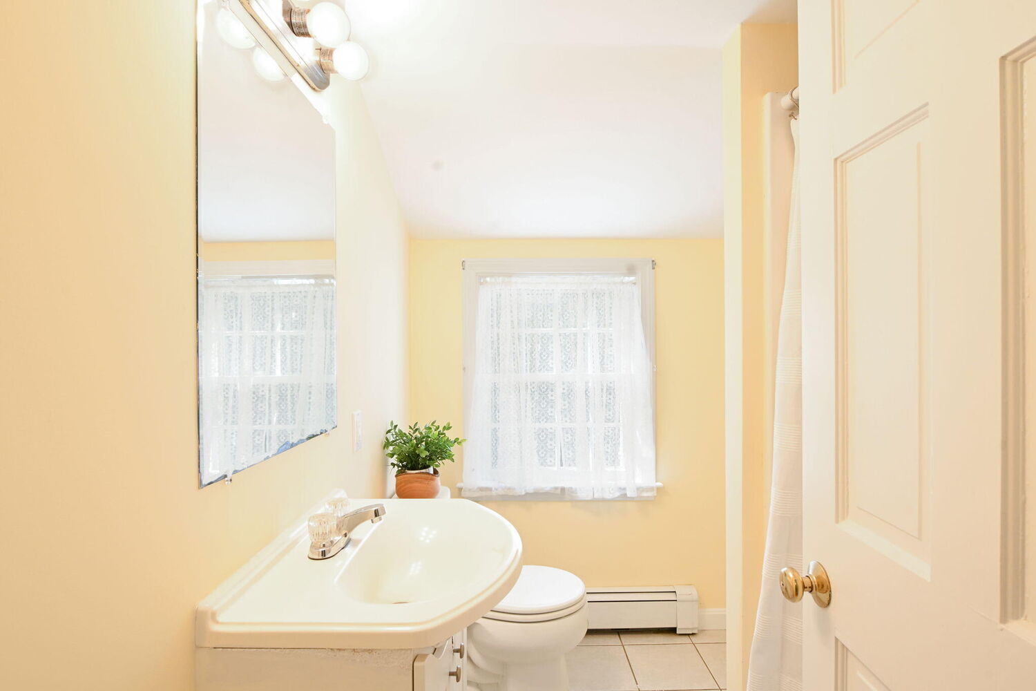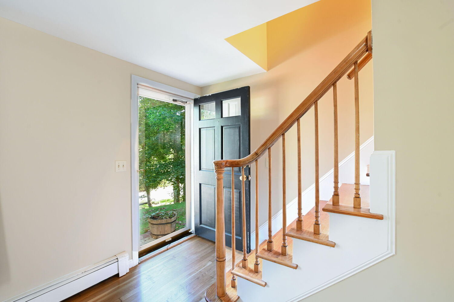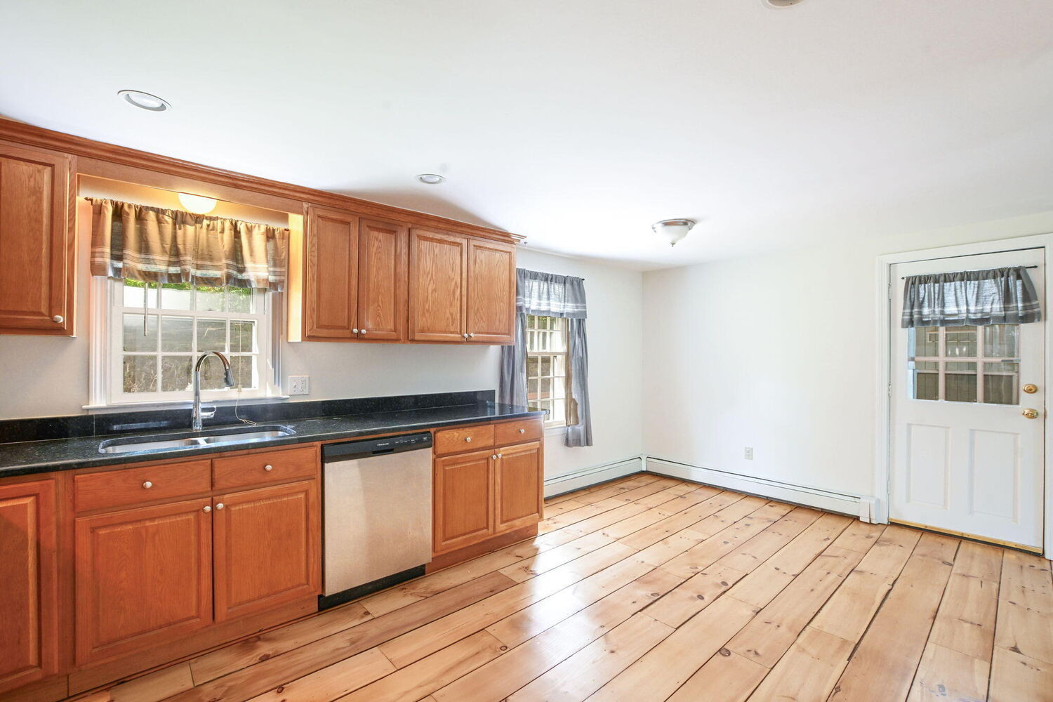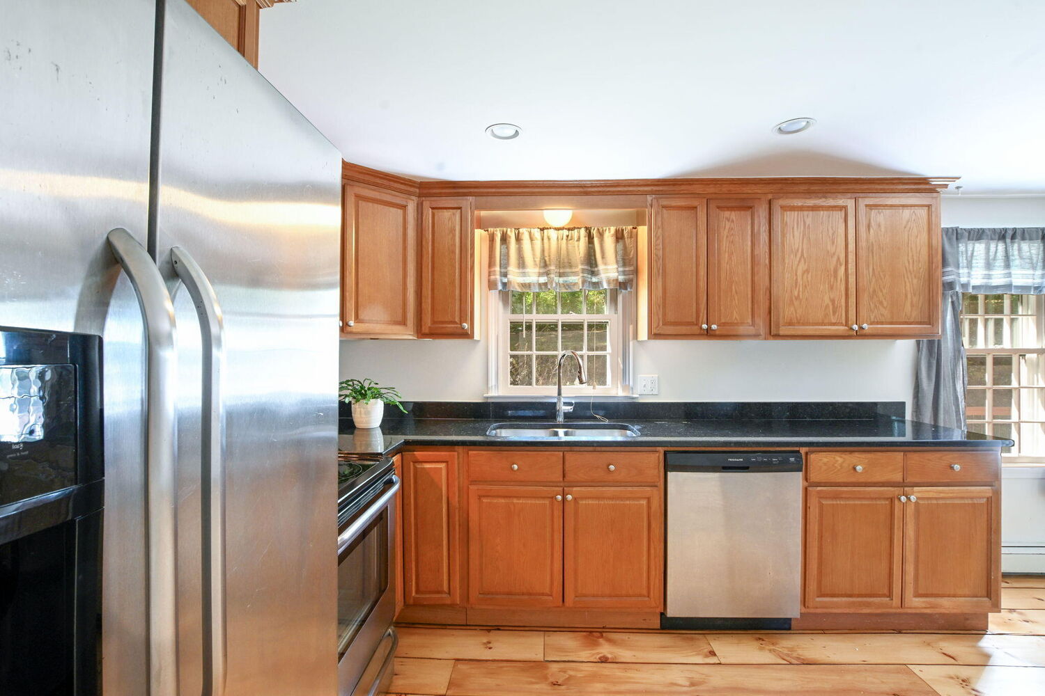 Snuggled in a neighborhood on a quiet side street off Main Street for peaceful living yet near all the amenities needed within two miles of home - shopping, restaurants, bike path, beach, marina, library. Ready to settle in? The main level features open kitchen/dining with wide pine floors, wood cabinets and stainless appliances - fireplaced living room - two bedrooms (or bedroom and office) - full bath. Upstairs are front to back bedroom and additional two rooms plus full bath. 7 total rooms/4 BR - wood floors throughout - enclosed breezeway with slider to patio - attached oversized garage -paved driveway - full basement. A lot to offer in a great location under $600,000.
