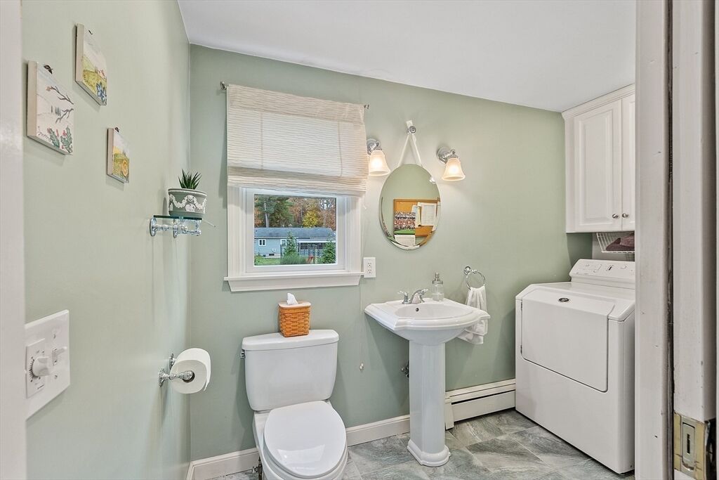 | Laundry | Bathroom - Half Flooring - Stone/Ceramic Tile Main Level Pedestal Sink First Floor Electric Dryer Hookup Washer Hookup |