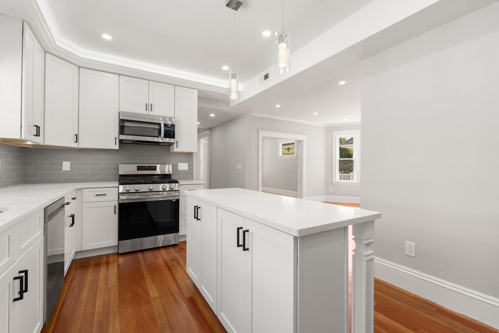 HIGHLY DESIRABLE EAST WATERTOWN LOCATION NEAR ARSENAL YARDS, SHOPS, RESTAURANTS, HARVARD SQ. BUS ALL ON A TREE LINED STREET! This home feels like a single family house with 2 levels of living! It features 4 bedrooms, 2 full baths, gorgeous recently renovated chef's kitchen with white cabinets and quartz countertops, gas cooking, in unit laundry, front and back porches, central air, gas heat, garage parking along with 3 spaces in driveway, common fenced in yard, newer windows, and great light! The floorplan is perfect with 3 bedrooms and a full bath on the upper level with laundry and one bedroom/office on main level with kitchen, living room, dining room and full bath. This is the one you have been waiting for!!