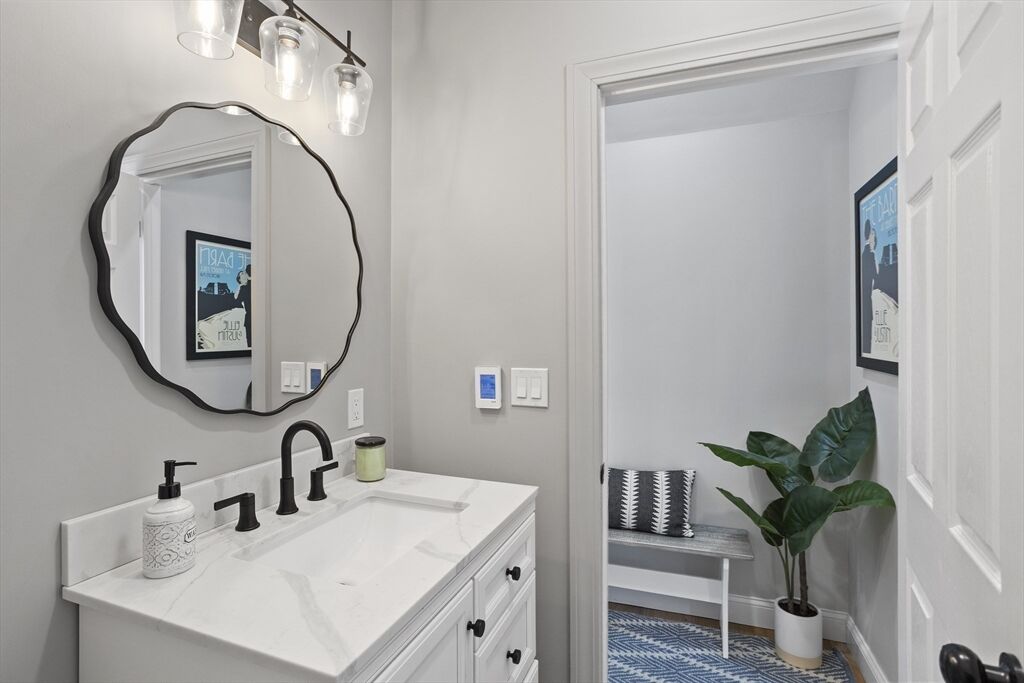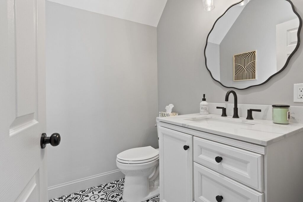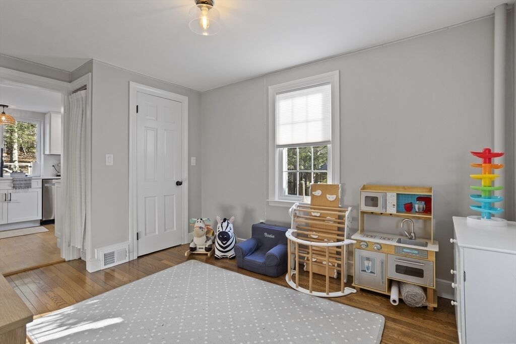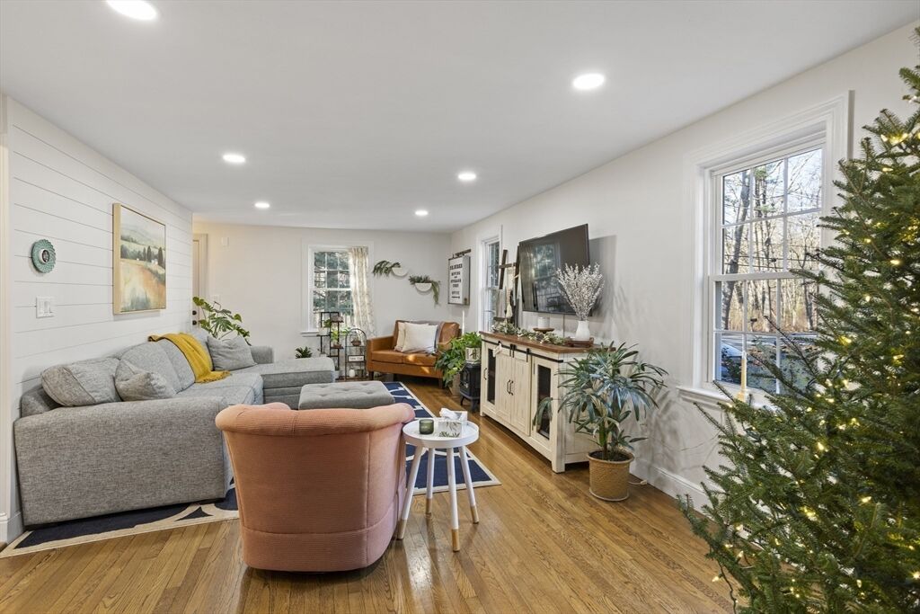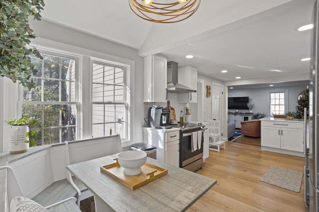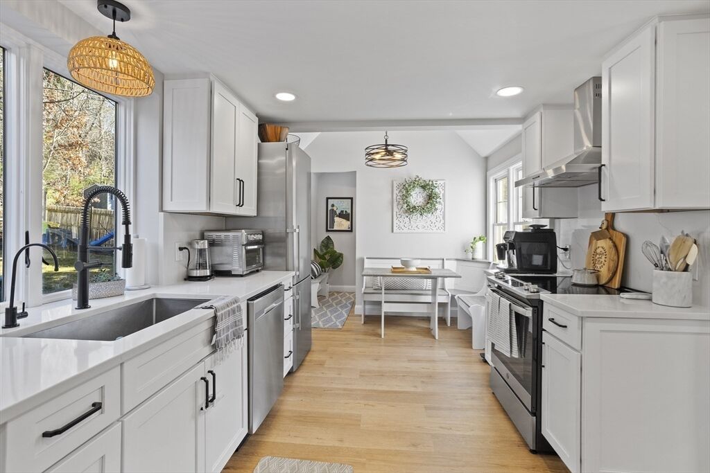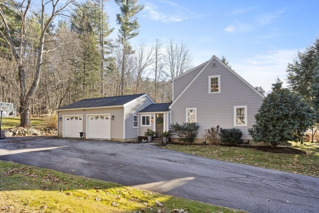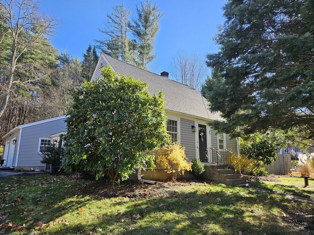 Quintessential country cape with stunning renovations and welcoming decor. Beautiful and bright new kitchen (2022) features white cabinetry, quartz countertops, stainless steel appliances, luxury vinyl flooring, and integrates a cozy breakfast nook. There is a brand new 1/2 bath with radiant heated tile flooring adjacent to this area. The front to back living room is the perfect spot to gather and relax. Gleaming hardwood floors carry through to the flex room (which can be used as a dining room, playroom or the 3rd bedroom),to the staircase and 2 upstairs bedrooms. With an enclosed breezeway and mudroom, access is easy from the 2 car finished and heated garage or from the exterior. A spacious fenced in back yard with fire-pit encourages outdoor activity and relaxation. This exceptional offering is ideally located close to shopping, services, conservation land, and is within 2.6 miles to the MBTA Station. A captivating and move-in ready home!