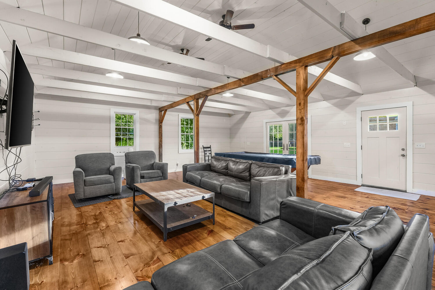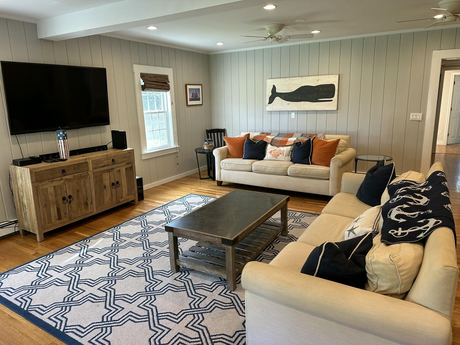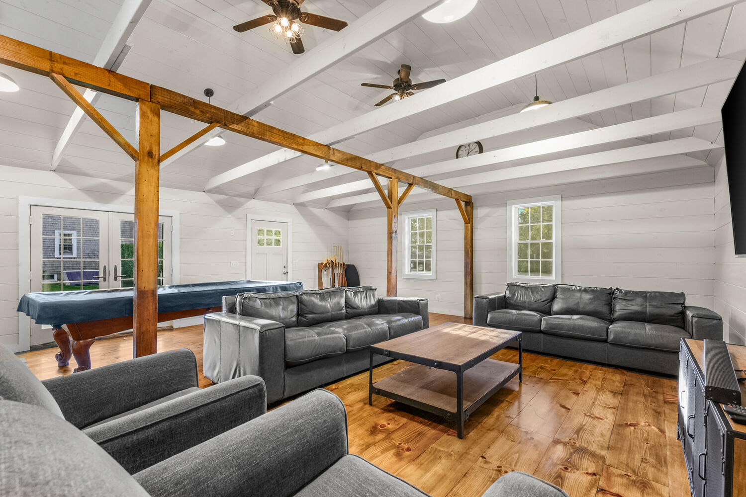 Dream retreat in Harwich for year-round living, seasonal getaways, or a rental investment property with a history of proven income. This home presents an ideal blend of comfort and style with great curb appeal, sitting on a 1.1 acre lot, it offers 5 BR, 3 BA across 2,592 sq ft of living space. Inside discover a spacious living area with hardwood floors that flow seamlessly throughout the home. The updated kitchen opens to an outdoor patio, expanding the living space outdoors. The main floor hosts two guest rooms and a primary ensuite with private bath, ensuring privacy and comfort. Upstairs, a family room, office, and two additional guest rooms provide ample space for memorable gatherings. The expansive outdoor area is perfect for entertaining, boasting large seating area with fire pit, granite bar/grilling station with bar stools, large dining table and a shower. The large green lawn invites summer games, while a detached 700 sq ft renovated barn converted into a recreation room offers a cozy retreat for rainy days or movie nights. Conveniently abutting the bike trail, close to Harwich Center and just a short drive to downtown Harwich Port and the Nantucket Sound beaches.