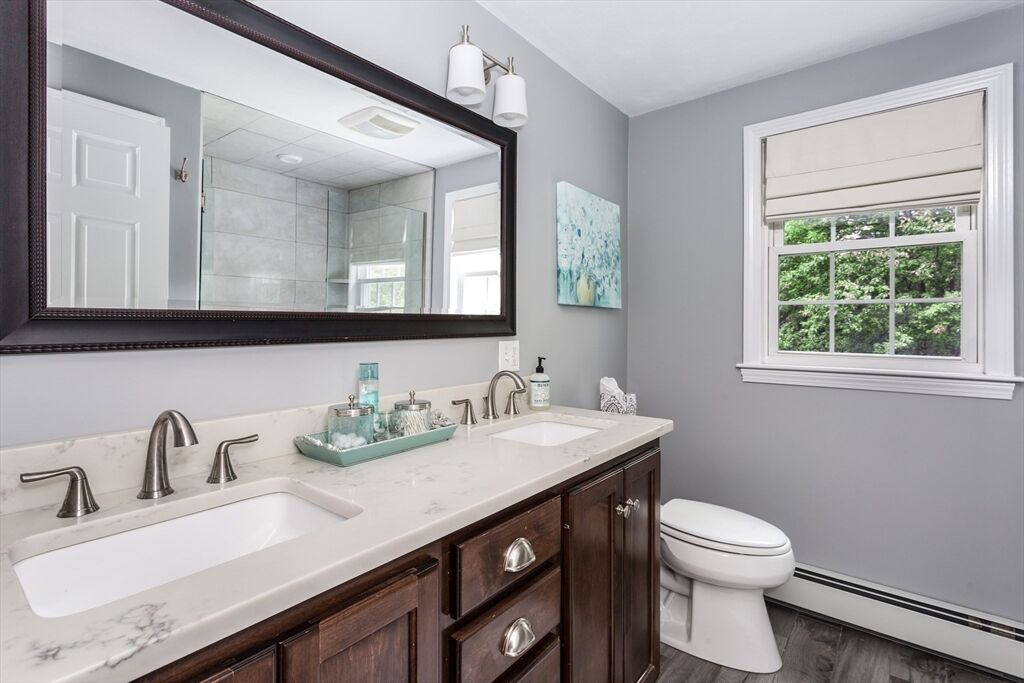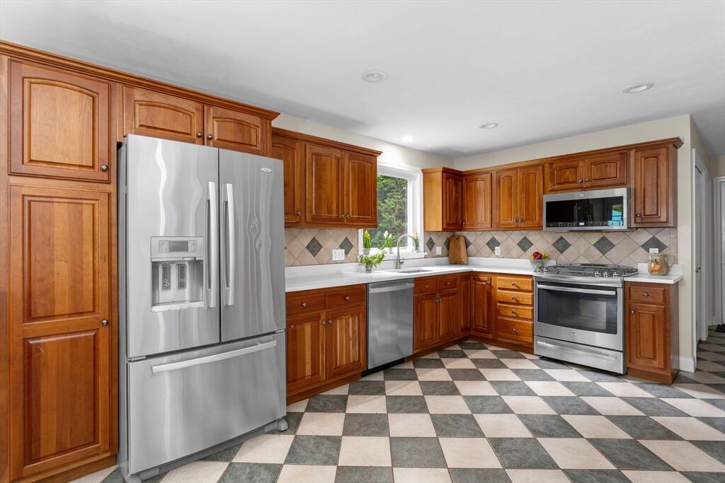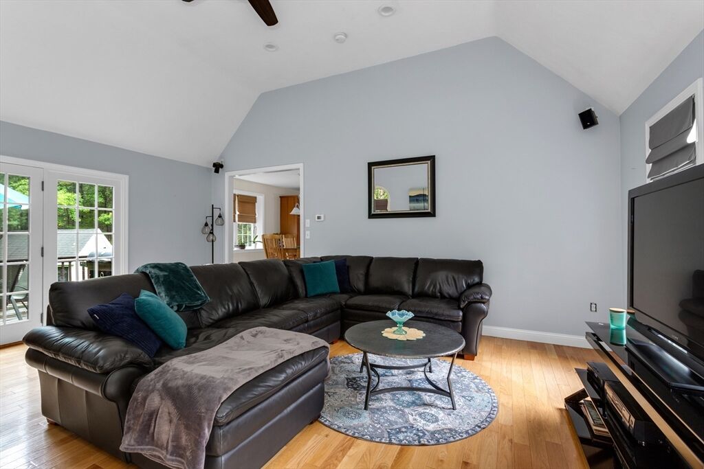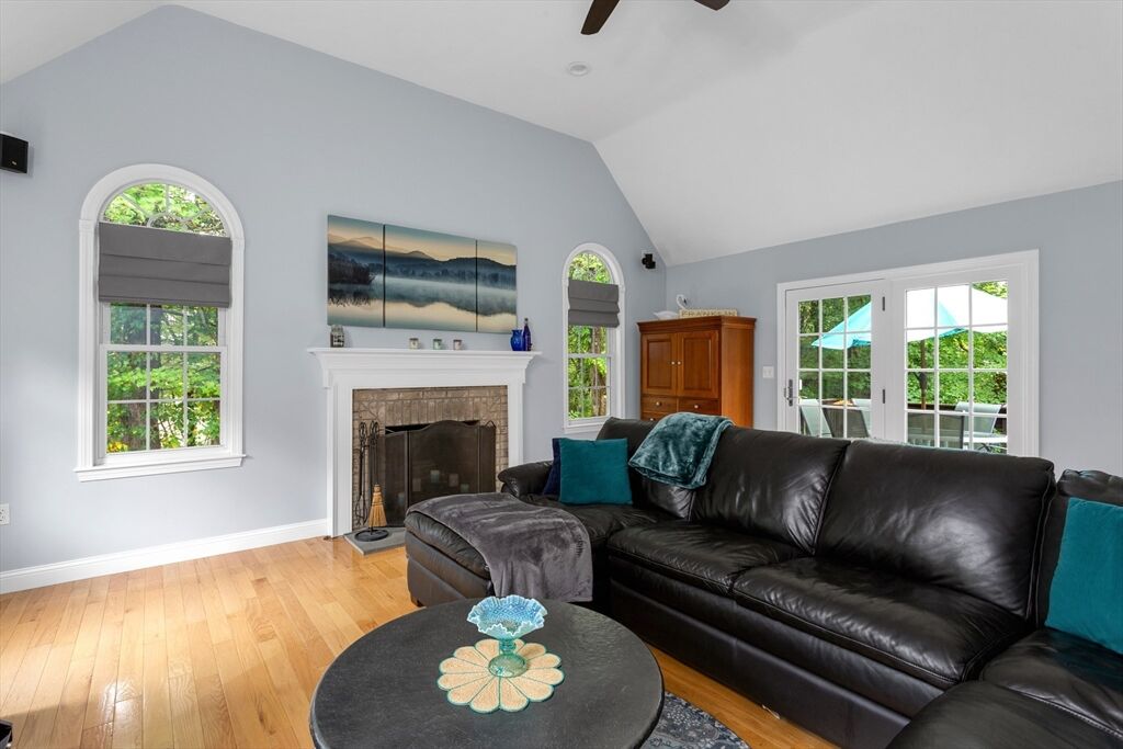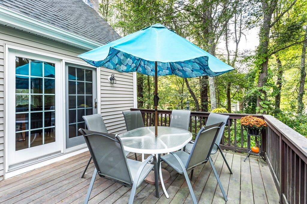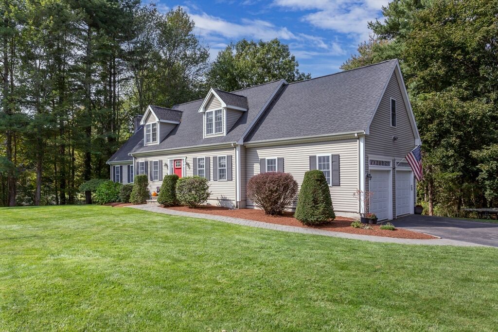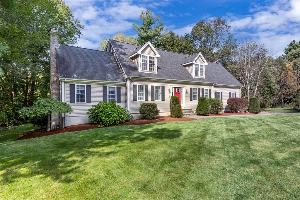 Looking for refined living in a desirable neighborhood? This 4 bedroom 3.5 bath Cape has an expansive eat-in kitchen with upgraded cherry cabinets, tiled floors, quartz counters and stainless steel appliances. It opens to a full sized dining room for maximum entertainment space and a mahogany deck for outdoor events. The open concept floor plan offers many possibilities for gatherings including a fireplaced living room to watch your favorite program or enjoy a cozy fire on a winter night. The family room, with built-in bookcases and cabinets, offers a quiet cozy area to talk quietly and relax in. Modern efficiencies with first floor laundry, new central a/c, energy efficient FHW Gas heating, Town water/sewer make for an easy to care for and comfortable home. The finished basement adds additional space for music, games, puzzles and projects. It includes a bedroom, full bathroom, a wet bar and walk-out to the backyard. Property abuts conservation land - privacy - quiet enjoyment.