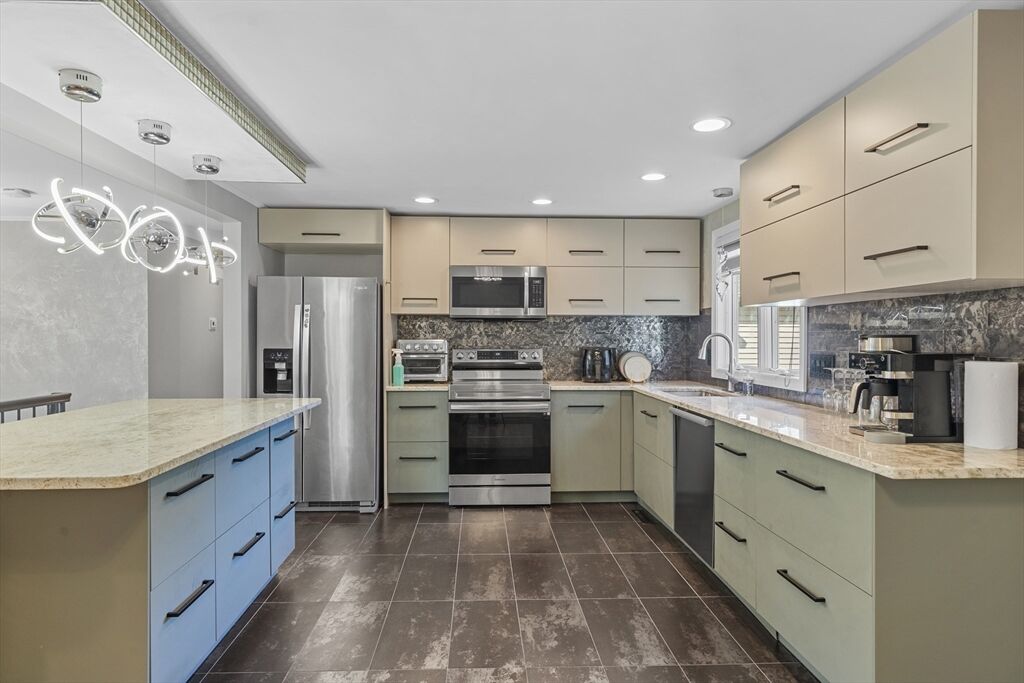 This beautifully remodeled home offers a spacious open floor plan and thoughtful upgrades throughout. Features include updated wiring and plumbing, and a newer water heater. All windows have been replaced—brand new on the first floor and newer on the second. The chef’s kitchen is a true showstopper, featuring top-of-the-line stainless steel appliances (Miele & Samsung), granite countertops, a tiled backsplash, pendant and recessed lighting, and a large center island with additional cabinetry. The dining and living rooms are conveniently located just off the kitchen—perfect for entertaining. The enormous primary suite is a private retreat with cathedral ceilings, an electric fireplace, two custom closets, a luxurious full bath, and its own balcony. A separate office is also located off the master, ideal for remote work. Additional highlights include ample closet space with custom built-ins, a pull-down attic for extra storage, and an oversized 2-car garage with brand-new flooring.
