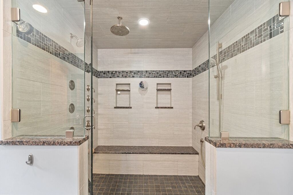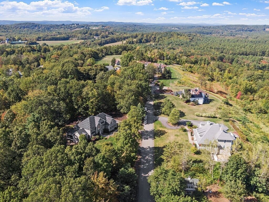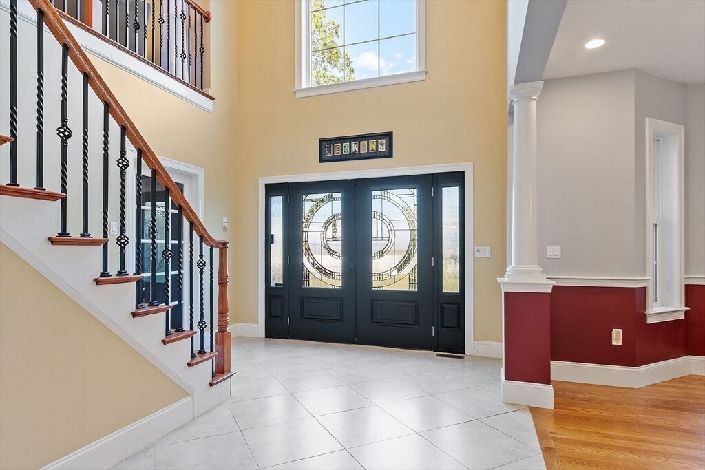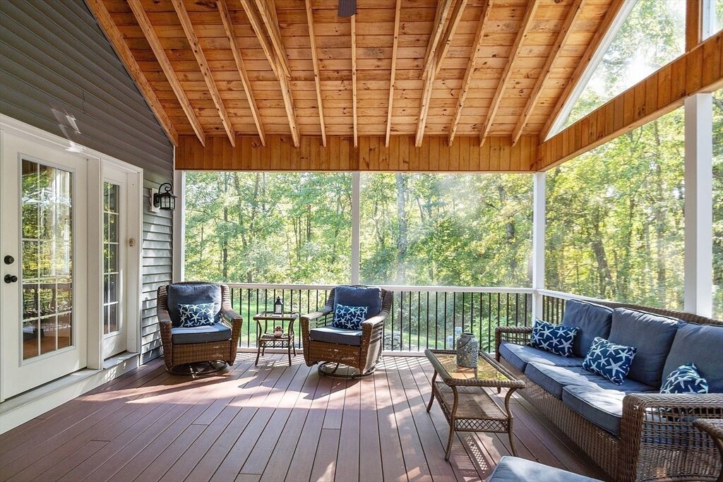 Nestled in this treetop neighborhood is this impressive, stone front 4 bed Colonial where design, efficiency & luxury meet. Built with steel beam reinforcement & 2x6 construction, this home features seller-owned solar panels delivering 300A of power. Spacious layout includes a library, luxurious primary suite & step-down family room with 15' ceilings which open to the kitchen/dining area. Enjoy a private home theater, bonus guest room w/half bath, first floor office/guest bedroom, three-season porch & expansive deck. Outdoors, relax to the soothing sounds of the waterfall feature, impressive patio stonework,6-person Bullfrog hot tub & above-ground pool. Dual furnaces & hot water heaters ensure comfort year-round. This prime location is minutes to highways, center of town & lakes—this rare home blends elegance, sustainability & location!