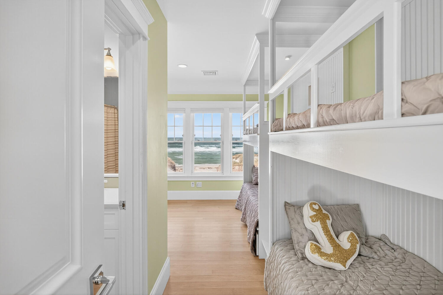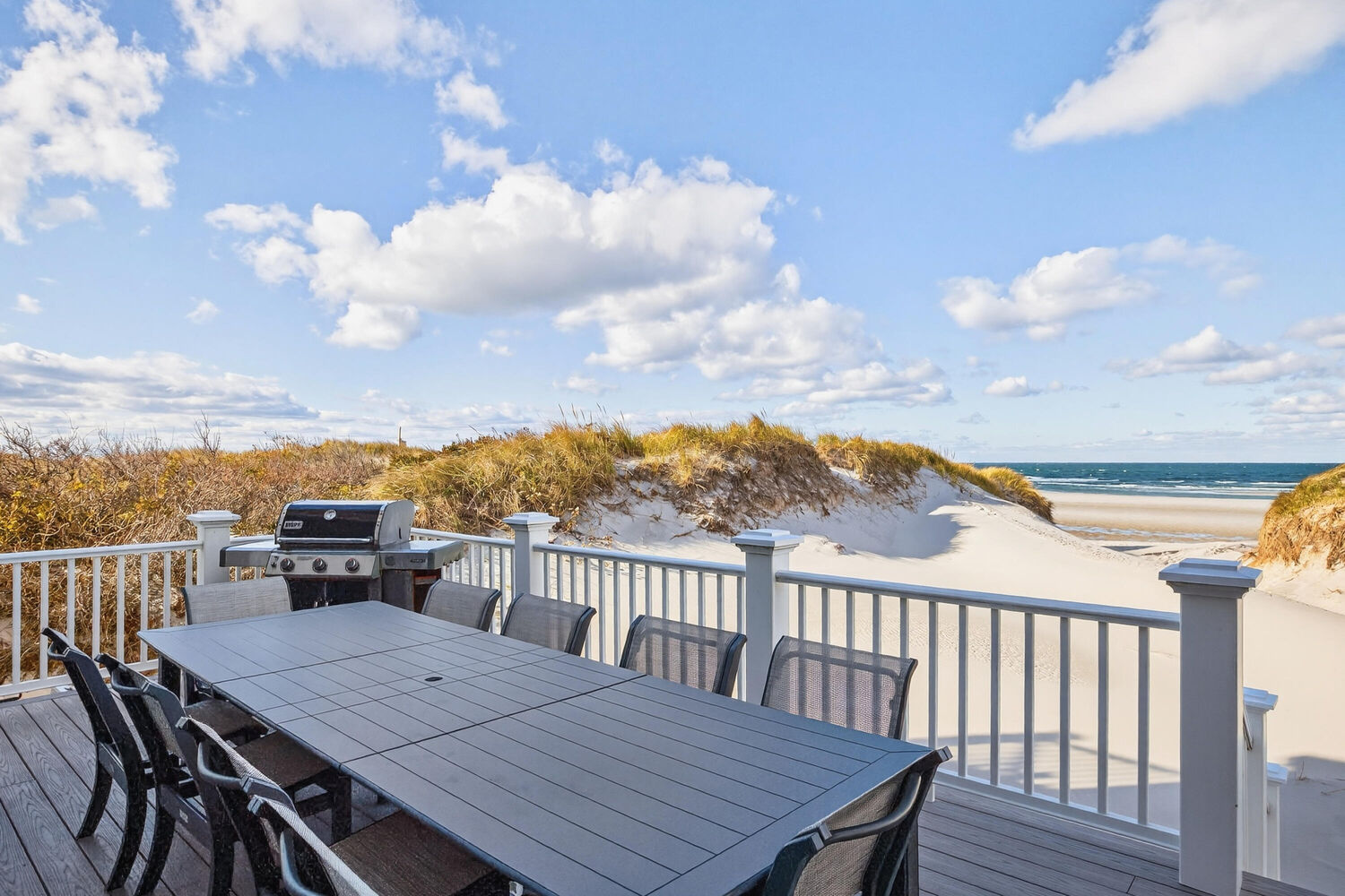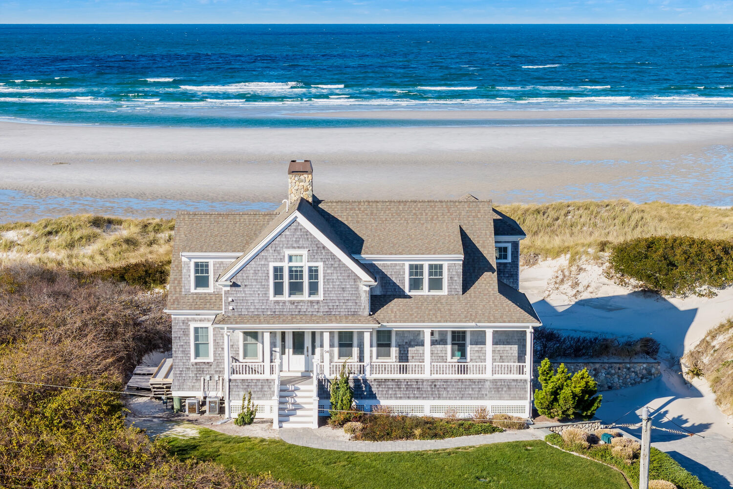 Perched along the pristine shores of Cape Cod Bay, this exceptional East Dennis beachfront residence offers a rare opportunity to own 110 feet of private sandy beach with sweeping panoramic views of the bay. Designed for effortless coastal living, this four-bedroom, four-and-one-half-bath contemporary captures the essence of seaside luxury--from sun-drenched interiors to expansive waterfront decks perfect for entertaining or quiet reflection by the sea. Custom-built by the current owners with no expense spared, this home showcases unobstructed bay views from every ocean-facing room. Upon entering, you're greeted by a spacious great room with sliders that draw the eye immediately to the sparkling water beyond. Comfortable seating, a sleek built-in gas fireplace, and a wall-mounted media center create a warm and inviting focal point for gatherings. The great room flows seamlessly into a spectacular chef's kitchen appointed with top-of-the-line appliances, a generous center island, and spacious and open dining area-all oriented toward the breathtaking waterfront backdrop. The first-floor primary suite provides a private sanctuary with its spa-like bath and sliders to an ocean-view deck, creating a serene retreat with an intimate connection to the outdoors. Upstairs, the upper level hosts three light-filled en suite bedrooms with spectacular water vistas and refined coastal finishes. The generous oceanside deck extends the living space outward, inviting effortless gatherings with multiple seating and dining areas perfectly positioned to take in the ever-changing light and gentle rhythm of the bay. A private seasonal boardwalk leads directly from the deck to one of Cape Cod's most beautiful stretches of beach, perfect for morning walks and unforgettable sunsets. Additional highlights include a built-in Sonos sound system throughout, a media room on the lower level, an attached garage, and beautiful curb appeal enhanced by a covered front porch and manicured coastal landscaping. With its strong rental history, modern amenities, and unparalleled beachfront setting, this property presents a rare opportunity to experience the very best of Cape Cod oceanfront living as a summer retreat, investment property, or year-round coastal haven.
