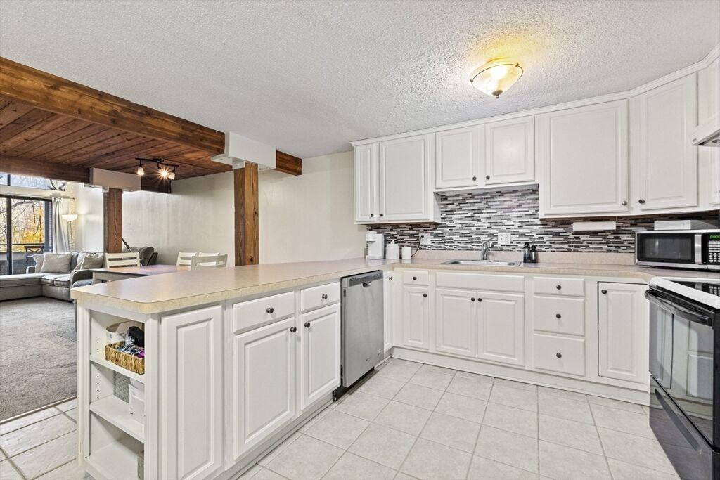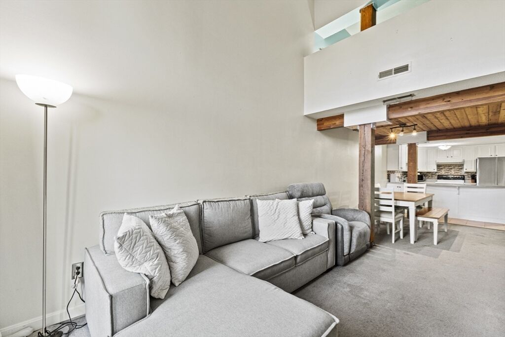 Welcome to River Bend Condominiums in Taunton! This inviting midrise condo features an open floor plan with a spacious living room, cathedral ceilings, sliders to a private balcony, and scenic river views. The dining area with wood-paneled, beamed ceiling opens to a well-appointed kitchen with a breakfast bar, white cabinets, tile backsplash, stainless steel appliances, and ample counter space. A first-floor bedroom with balcony access and a loft-style second bedroom offer flexible living. The unit has been well maintained with a new furnace (2025), water tank (2024), and recently replaced refrigerator and dishwasher. Community amenities include in-building laundry, a playground, tennis and indoor racquetball courts, a gym, a gathering room, and an in-ground pool. Conveniently close to shopping, the new commuter rail line, and Route 24. Don’t miss this one!