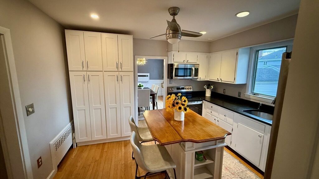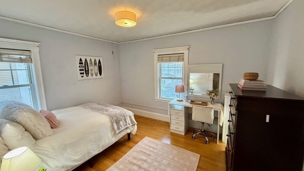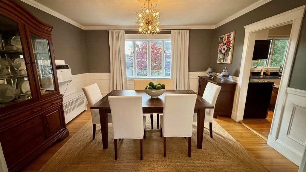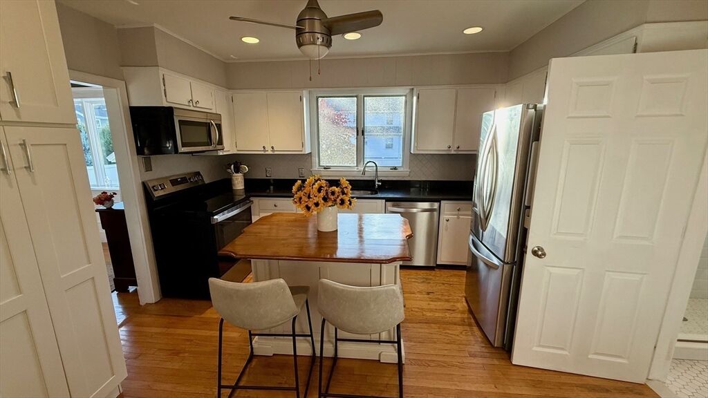 RARE OPPORTUNITY IN LAWRENCE ESTATES! 3-bedroom 2.5-bath on quiet road offers everything today's buyers want. Move-in ready with hardwood floors throughout and thoughtfully updated spaces including a granite kitchen with expansive pantry storage. The versatile first floor features living room, formal dining room, kitchen, and a flexible office/4th bedroom with closet, plus a remodeled full bath (2021). Three bedrooms upstairs including a primary with oversized double closet and custom organization system, plus remodeled full bath (2019). Pull-down attic access provides ample storage. Finished basement includes spacious family room, custom granite bar, surround sound, full-size stainless fridge, half bath with laundry featuring brand new high-end washer/dryer (2025). Updated systems include heating (2010) and hot water tank (2023).Side-by-side driveway with parking for 3-4 cars-a huge plus! Fells reservation trails at end of block. Walk to Medford Sq. High demand neighborhood!