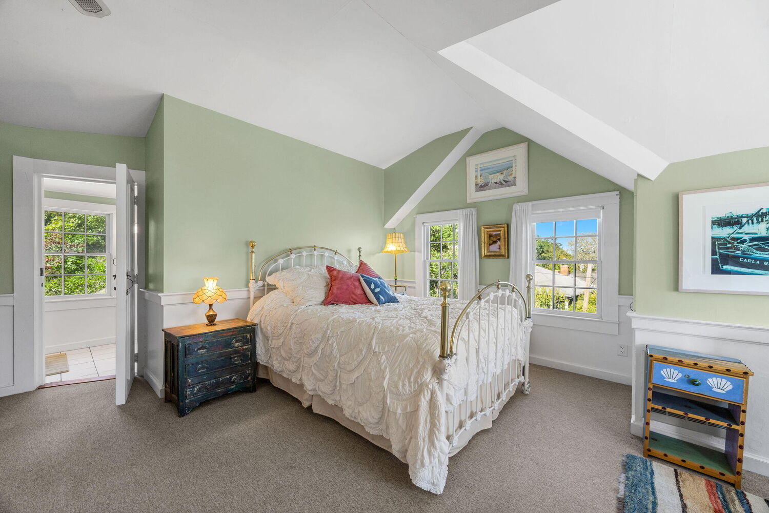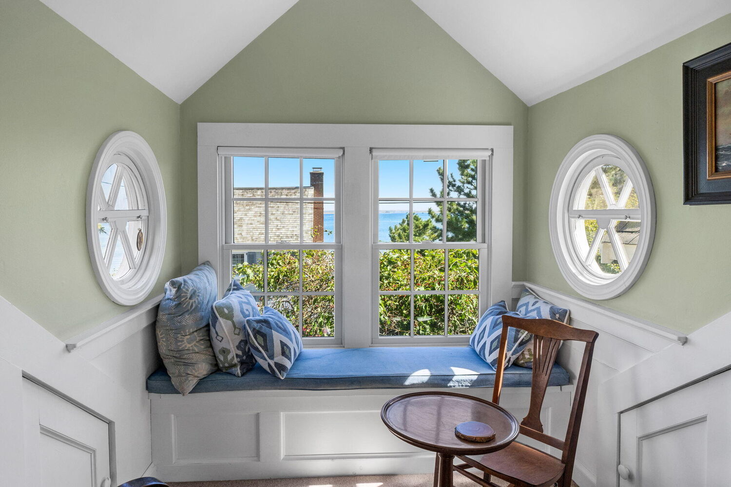 High on Gull Hill in Provincetown's West End sits Westwinds--a rare find in one of the town's most coveted spots. This romantic 2-bedroom, 2-bath home offers 1,288 sq ft across two floors, filled with period charm and timeless character. The first level features beamed ceilings, a cozy living room with a gas woodstove, and a guest bedroom, both with lovely views of the bay. A dining room just off the galley kitchen opens through French doors to a spacious deck, perfect for morning coffee or entertaining friends and family. Upstairs, the entire level is devoted to the primary suite, complete with cathedral ceilings, two dormers large enough to nestle in, and sweeping water views. The grounds are beautifully landscaped and professionally cared for, leading to a large, heated pool for residents to enjoy. From your front door, it's just steps to your own private beach access, with a bayside deck and stairs to the sand. The property also includes parking for one car, a sewer connection with betterment paid in full, and the distinction of belonging to a five-unit association where homes rarely come to market.