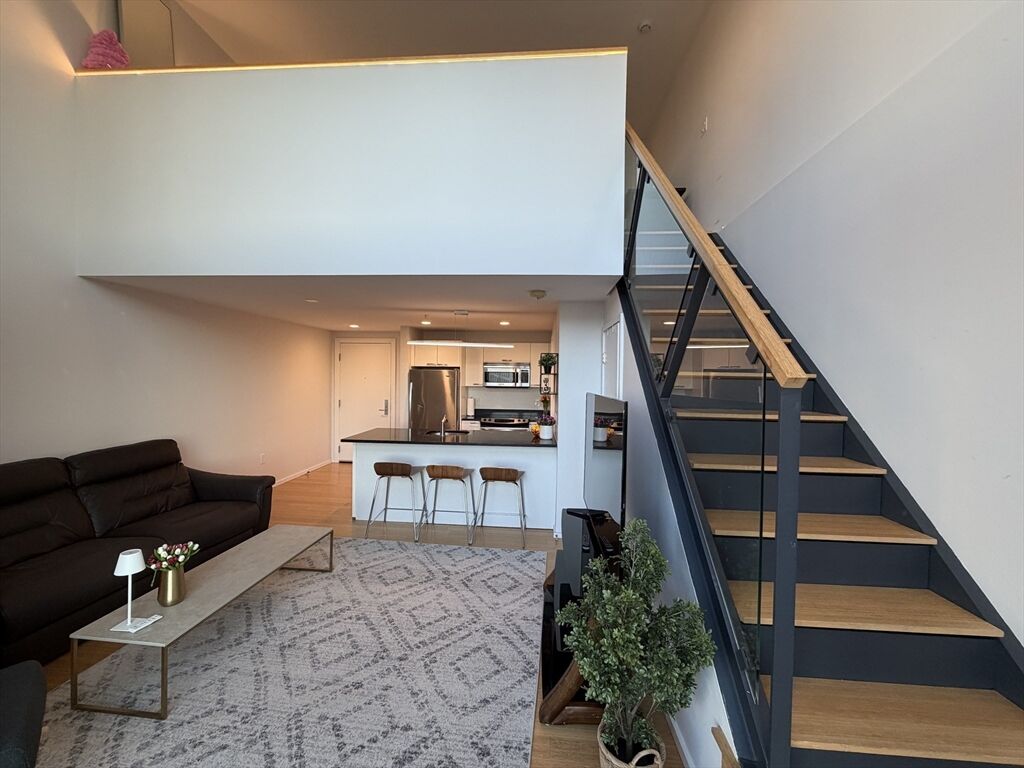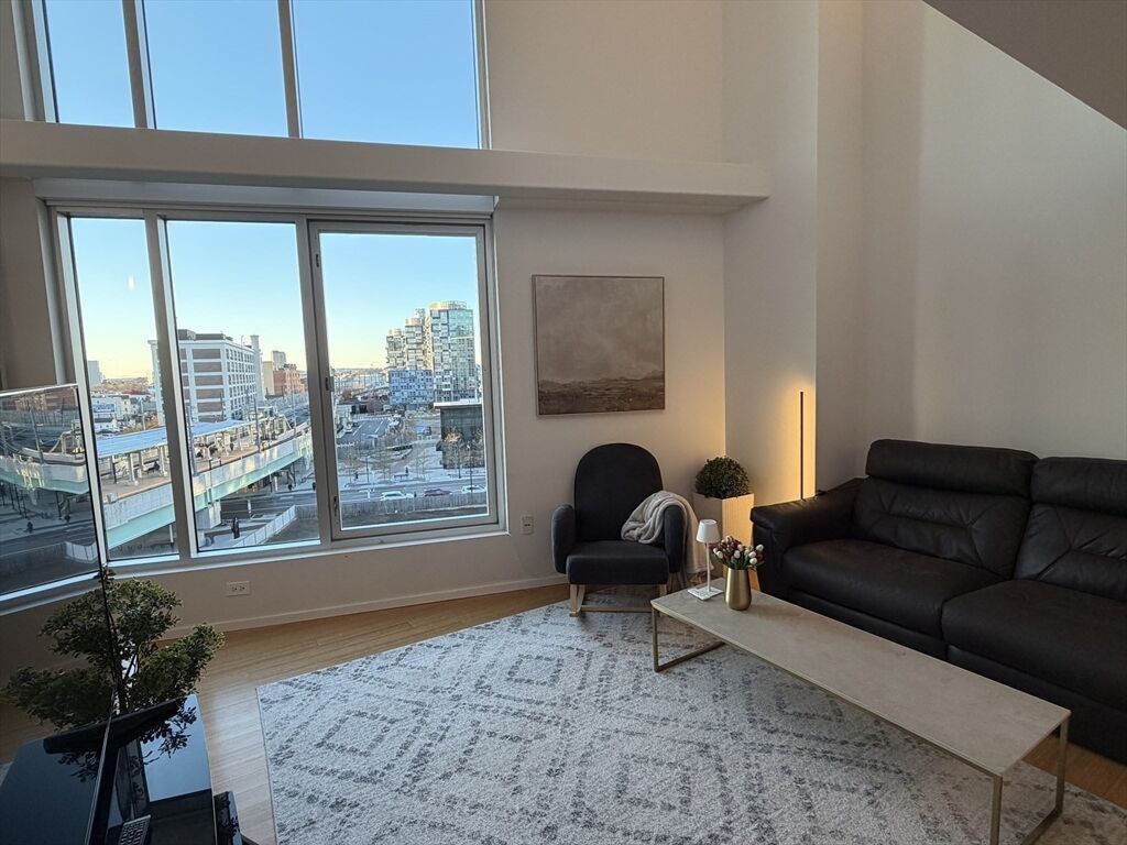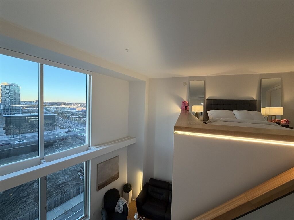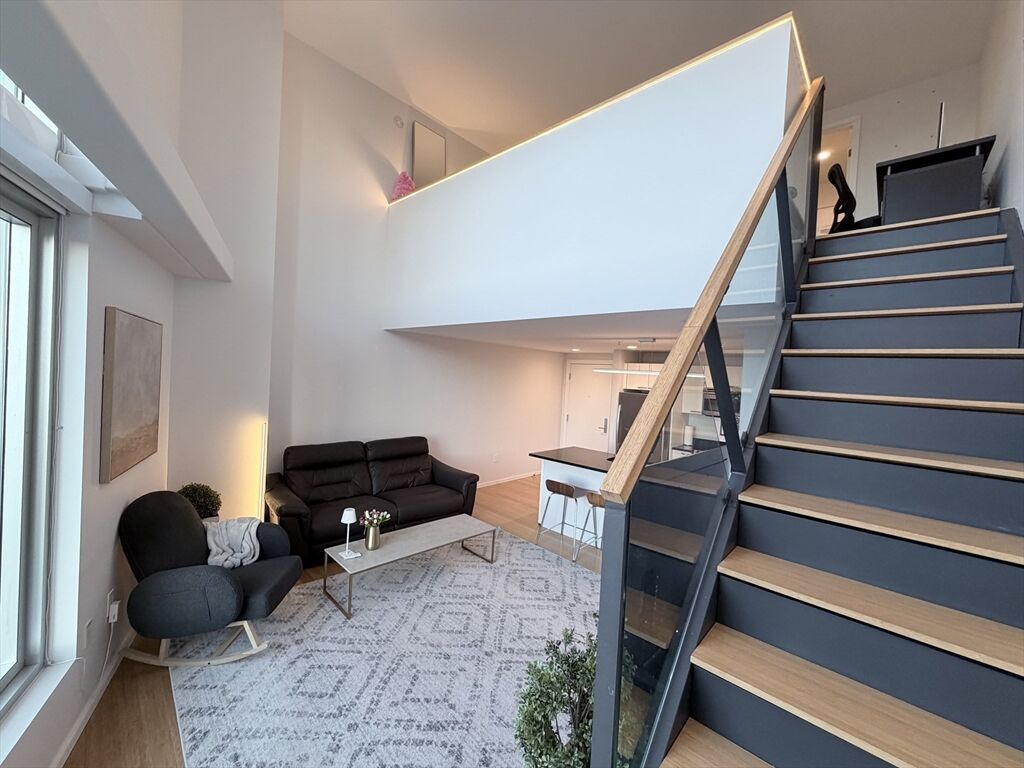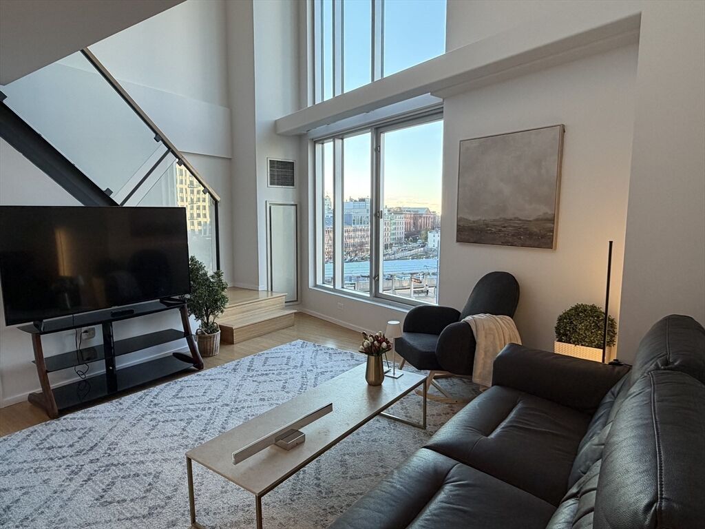 SUNSET PENTHOUSE MODERN LOFT — CX Cambridge Crossing the #1 biotech hub in the United States | Sierra + Tango Condominium. PH 725 is a striking modern penthouse loft duplex defined by its dramatic 17-ft floor-to-ceiling windows that frame sweeping sunset views. The first level features bamboo hardwood flooring, an open-concept kitchen and living area, quartz countertops, stainless steel appliances, updated lighting, electric roller shades, and half bath with additional storage. The upper level offers a spacious, open primary suite complete with a walk-in closet, in-unit laundry and full bath. Complex provides premium amenities including a 24/7 concierge, bike storage, and free EZ bus Ride connecting to Kendall/MIT and North Station. Unbeatable location—minutes to Downtown Boston, Logan Airport, Charles River paths, Cambridgeside Mall, Museum of Science, MGH, restaurants, cafés, Whole Foods, and with the Green Line station right at your doorstep. Reasonable property tax.