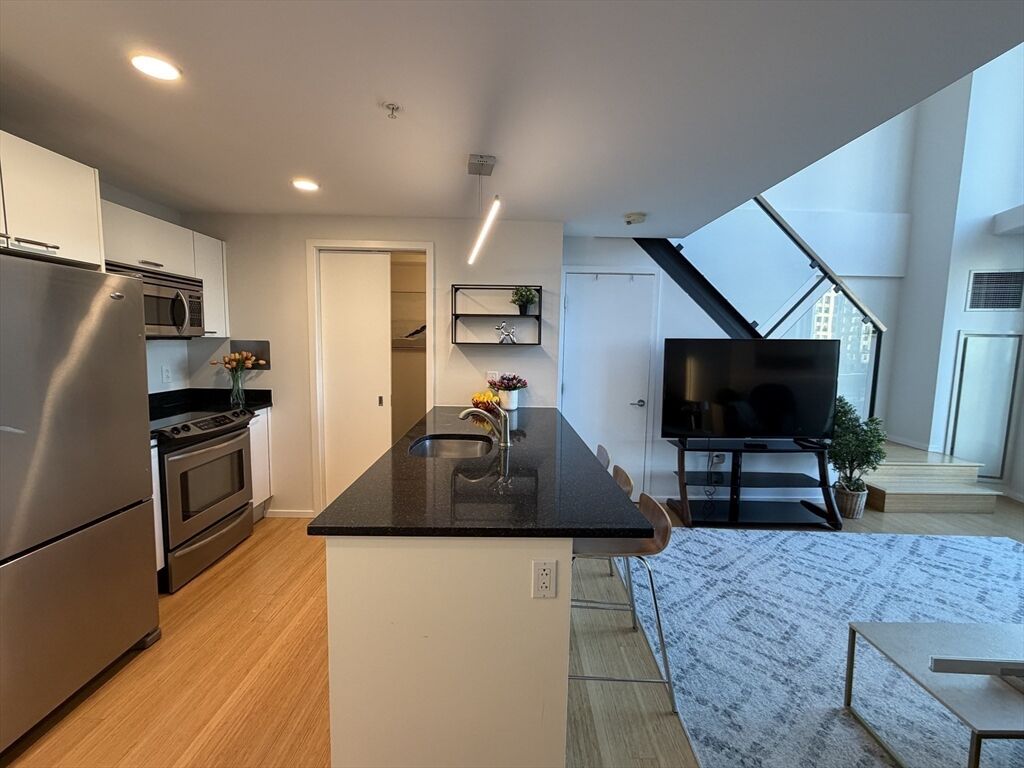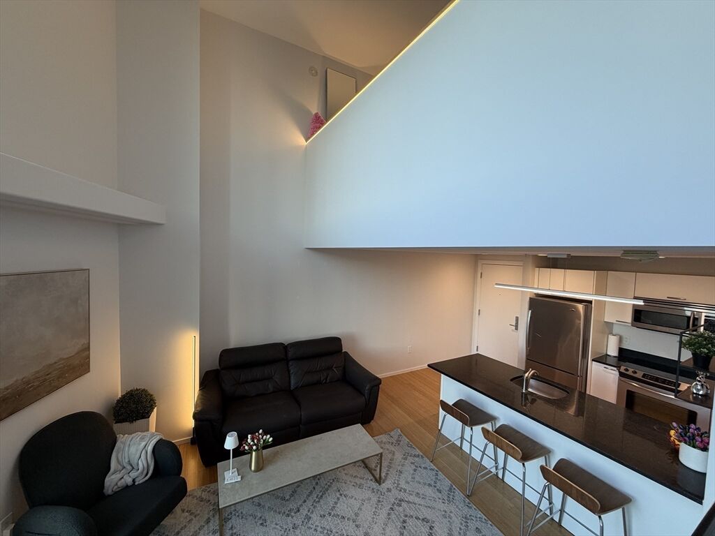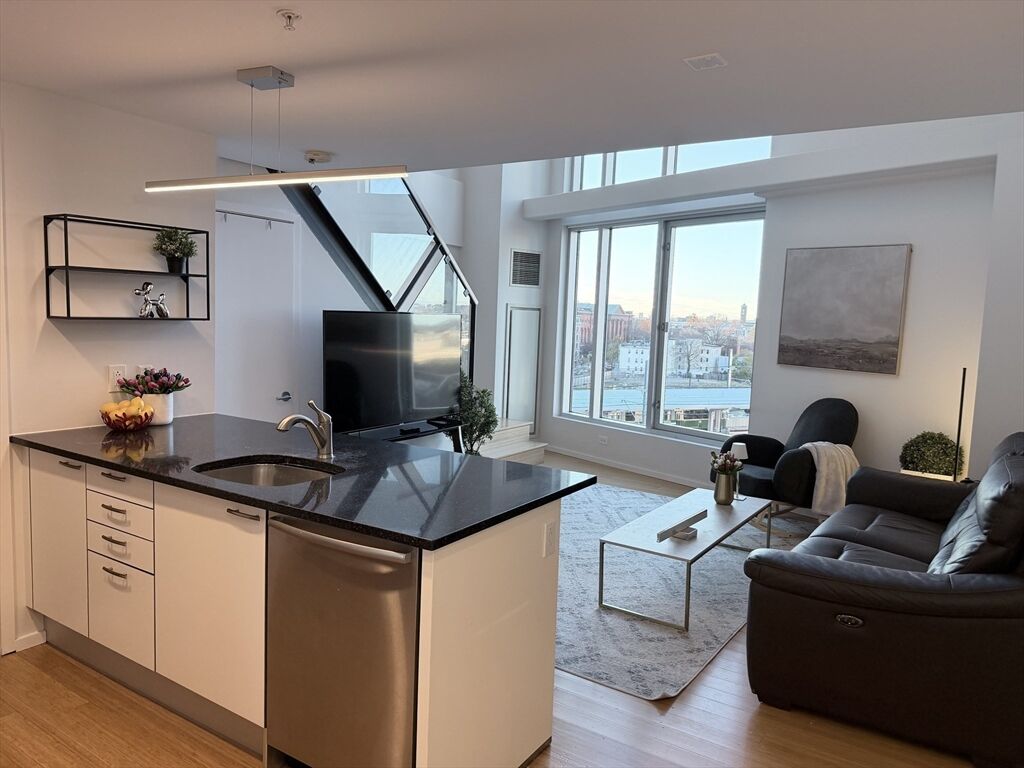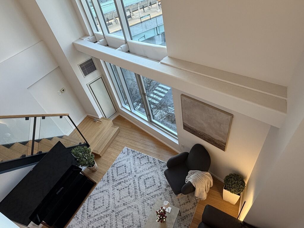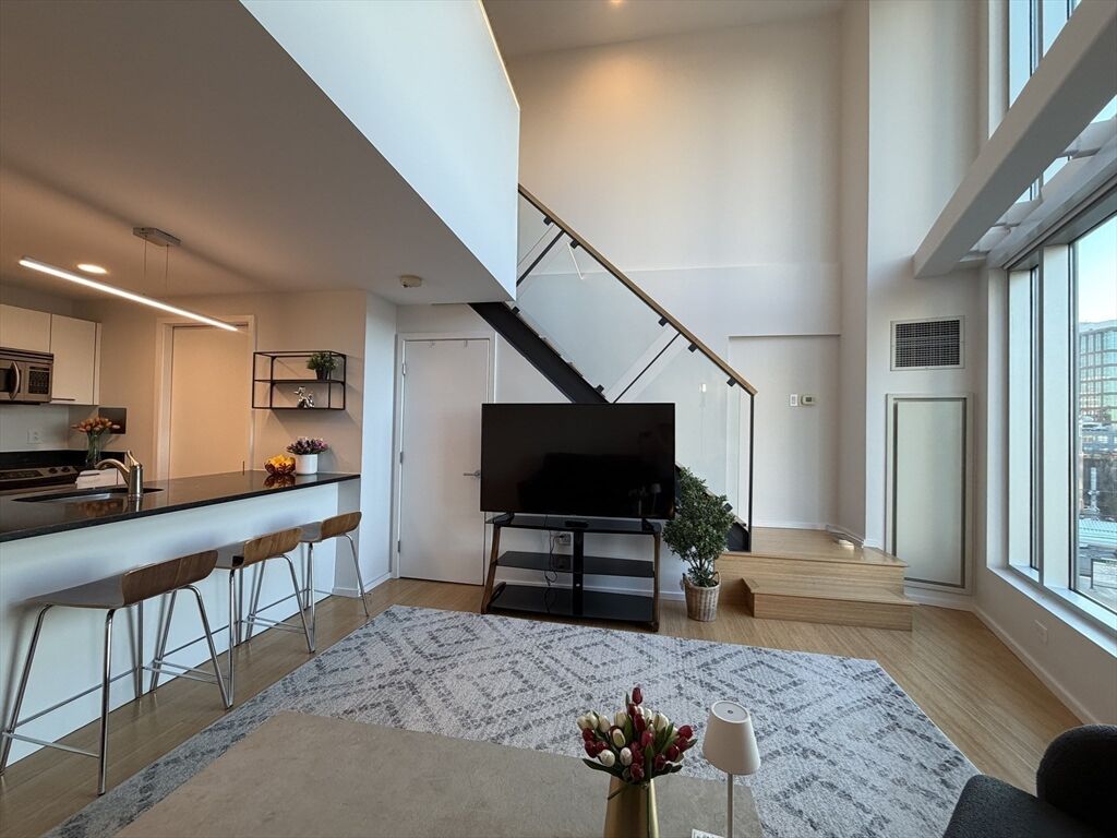 SUNSET PENTHOUSE MODERN LOFT — CX Cambridge Crossing the #1 biotech hub in the United States | Sierra + Tango Condominium. PH 725 is a striking modern penthouse loft duplex defined by its dramatic 17-ft floor-to-ceiling windows that frame sweeping sunset views. The first level features bamboo hardwood flooring, an open-concept kitchen and living area, quartz countertops, stainless steel appliances, updated lighting, electric roller shades, and half bath with additional storage. The upper level offers a spacious, open primary suite complete with a walk-in closet, in-unit laundry and full bath. Complex provides premium amenities including a 24/7 concierge, bike storage, and free EZ bus Ride connecting to Kendall/MIT and North Station. Unbeatable location—minutes to Downtown Boston, Logan Airport, Charles River paths, Cambridgeside Mall, Museum of Science, MGH, restaurants, cafés, Whole Foods, and with the Green Line station right at your doorstep. Reasonable property tax.