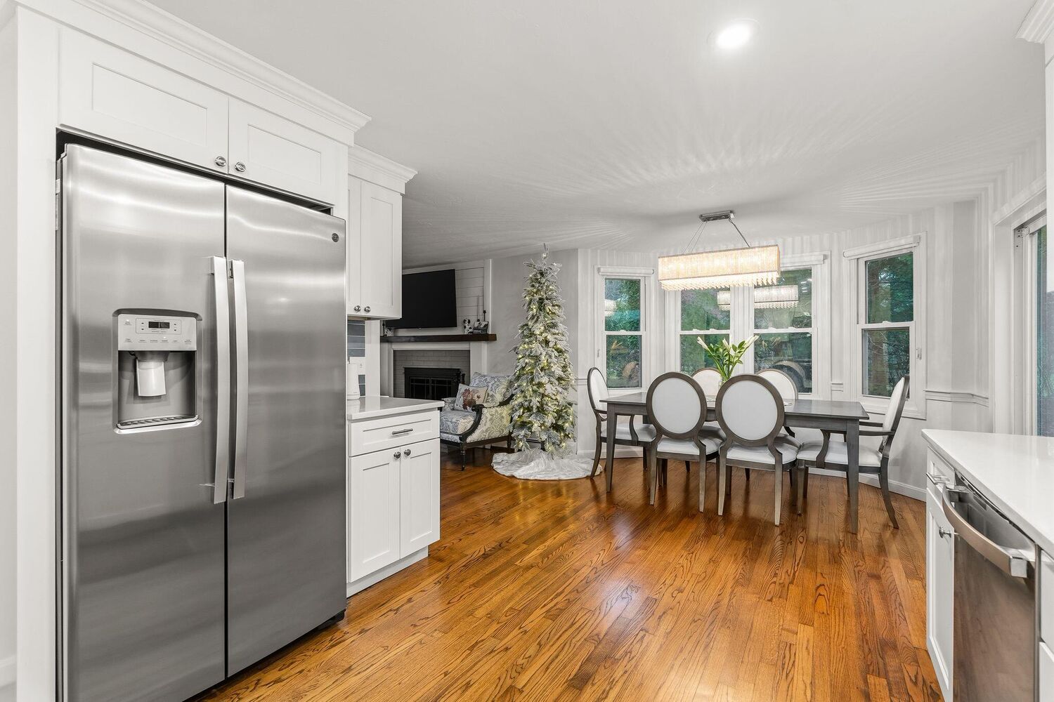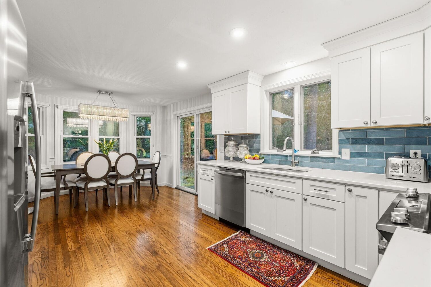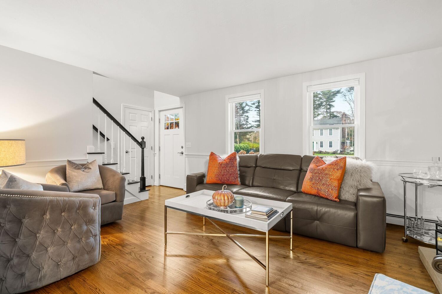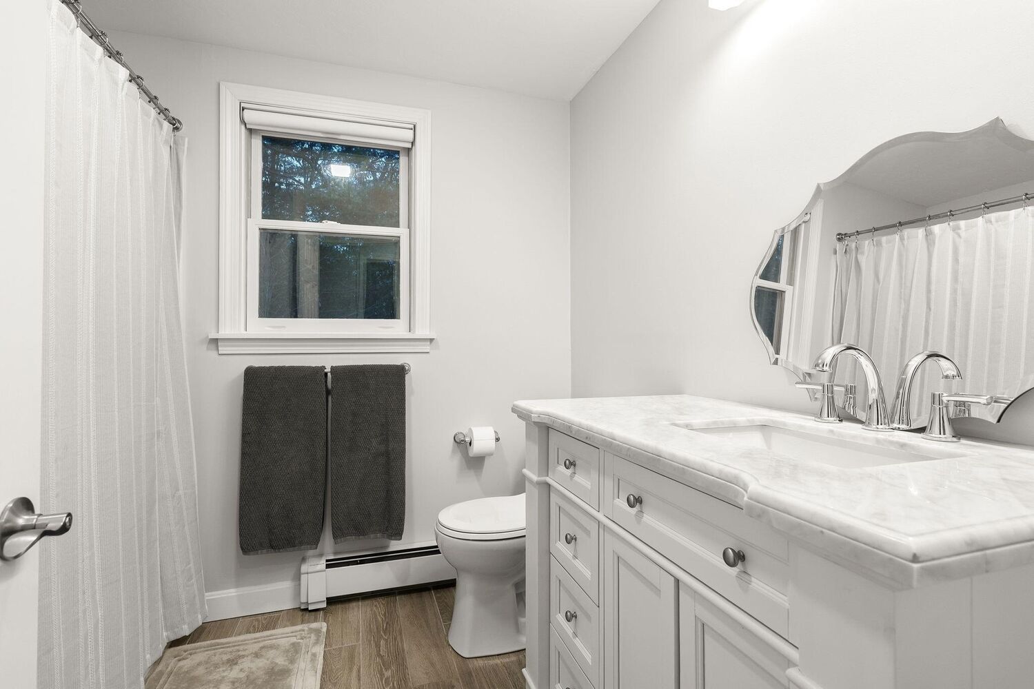 Thoughtfully updated four-bedroom Cape in the desirable Peter's Pond Estates. Recently completely renovated, the home opens with a warm and inviting living room featuring hardwood floors and a wood-burning fireplace. The renovated open concept kitchen sits just beyond, complete with quartz countertops, shaker cabinets, and stainless steel appliances. Two comfortable bedrooms complete the first floor. Upstairs, you'll find two expansive front-to-back bedrooms, each with double closets and generous space. Step outside and enjoy the spacious back deck overlooking a private yard, perfect for relaxing or entertaining. The full basement adds plenty of storage, and houses a high efficiency gas system with an on demand water heater. Take a stroll year-round down to beautiful Peter's Pond through the trails beyond the back yard. Located close to shopping, dining, and schools, this home is move-in ready, and primed for its next chapter!
