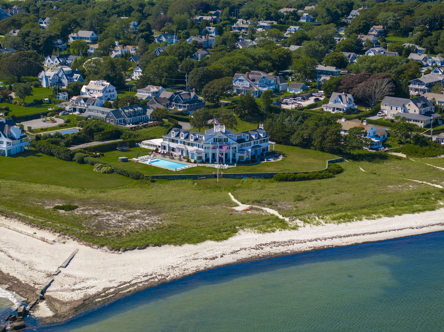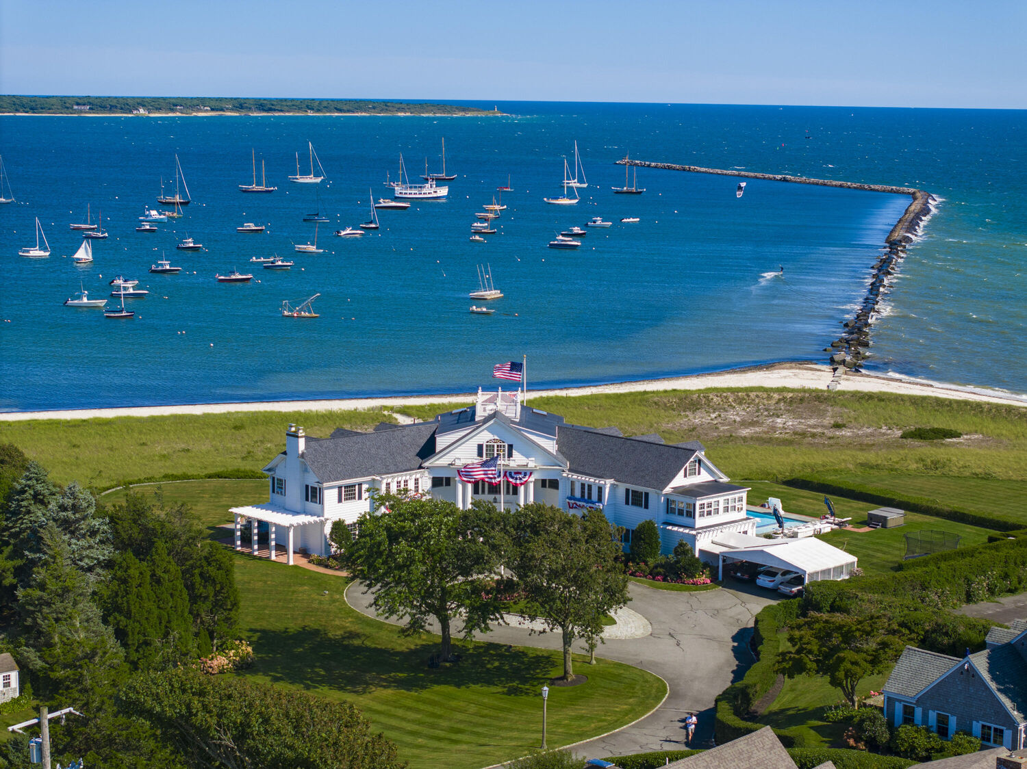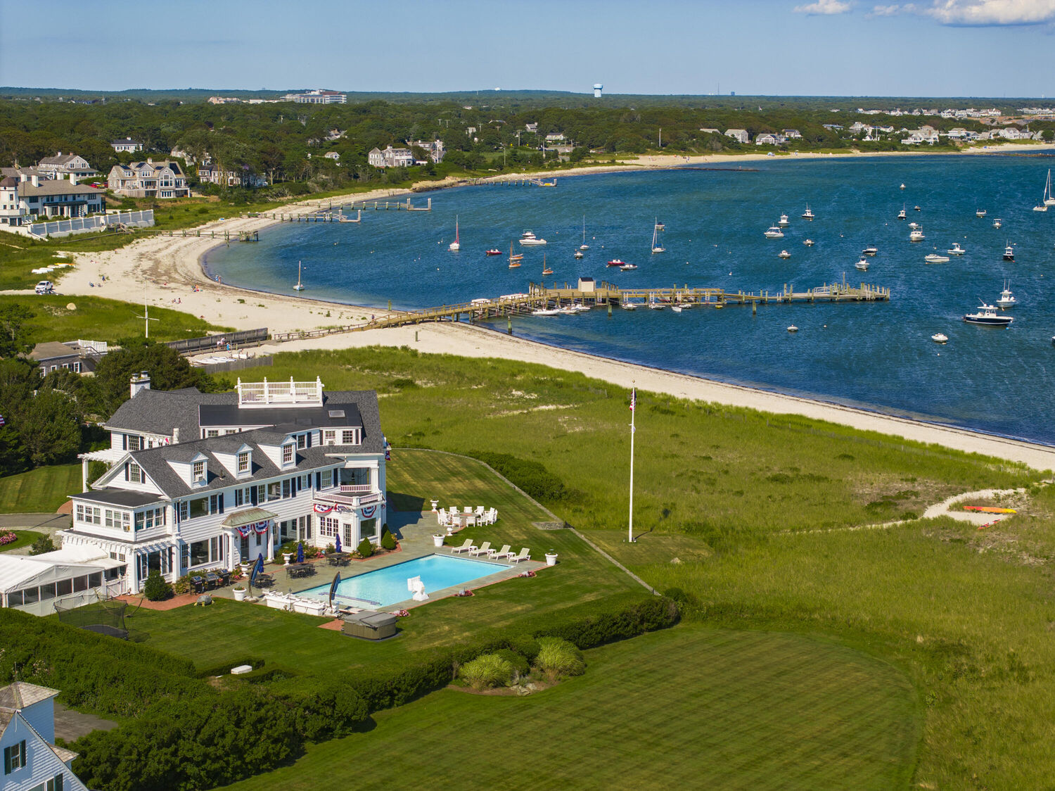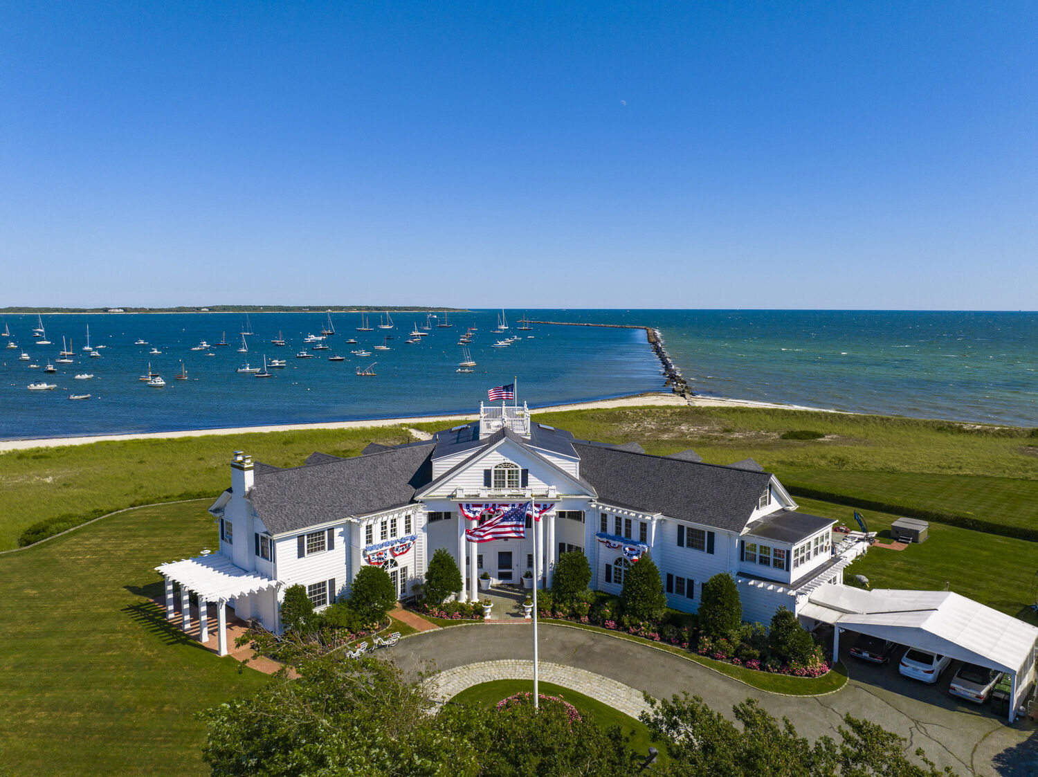 Welcome to Port View, one of New England's most iconic oceanfront properties! Nestled within the exclusive Cape Cod enclave of Hyannis Port, and sited proudly at the helm of the world-renowned Kennedy Compound, this one-of-a-kind coastal home and its famous neighbors have long epitomized a casual but classic American lifestyle. A gated driveway leads past rolling lawns and established landscapes by the legendary Olmstead brothers to reveal an impressive and stately 7 bedroom Main House, with panoramic water views of Hyannis harbor and the Nantucket Sound beyond! The perfect floorplan features large and gracious rooms with tall ceilings and beautiful architectural details throughout, including the fireplaced living and dining rooms, tavern, wood paneled library, sun porches, a third floor game room with mahogany inlay floors, and a widows walk with roof deck. Tremendous outdoor entertaining opportunities surround the large pool, hot tub, firepit and expansive ''wedding lawn'', which overlooks gorgeous dunes and nearly 500' of private beachfront. An icon in every sense, Port View is a pleasure to show, by appointment only.